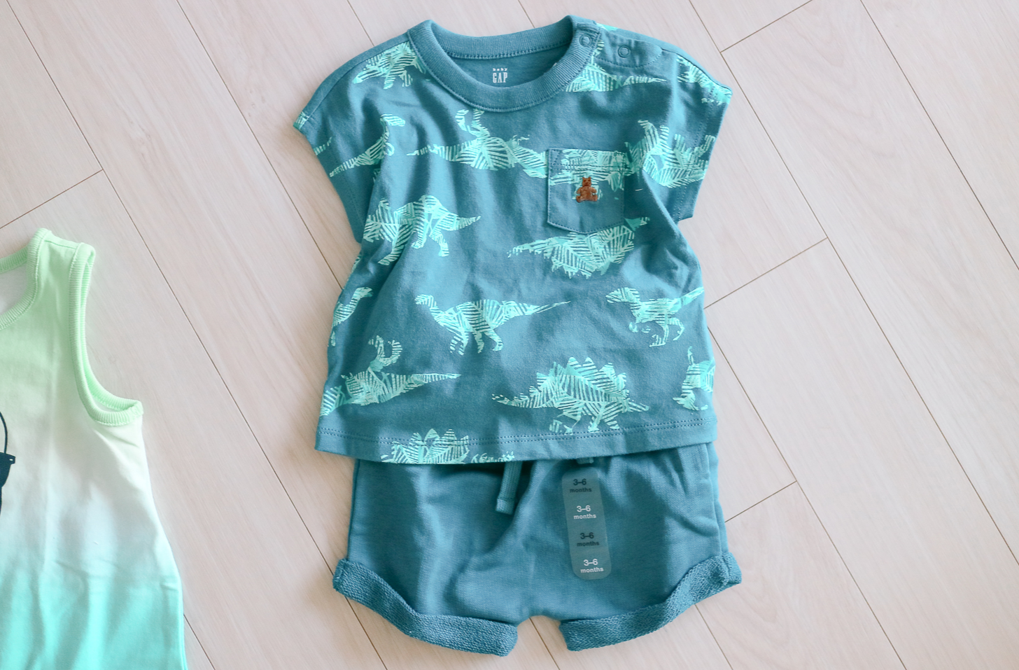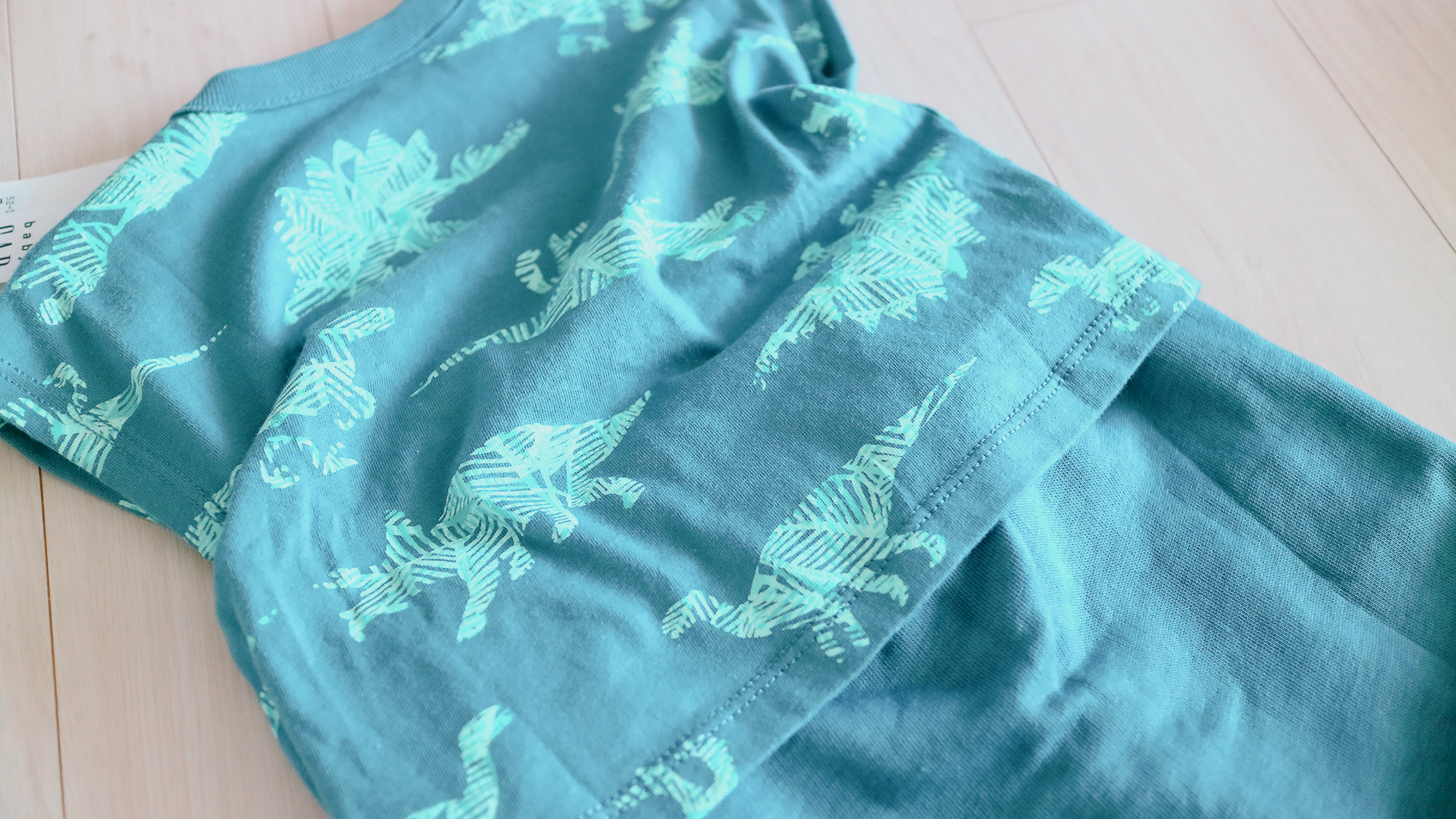그리고 이름을 끝내 찾지 못한 상하의 세트 2종. 하나는 그레이, 네이비 베이직한 컬러감으로 gap classic 페인팅이 있는 상하 세트이다. 나머지 하나는 선물 받은 제품 중 가장 예쁜 공룡 형태의 패턴이 있는 상하의 세트이다.