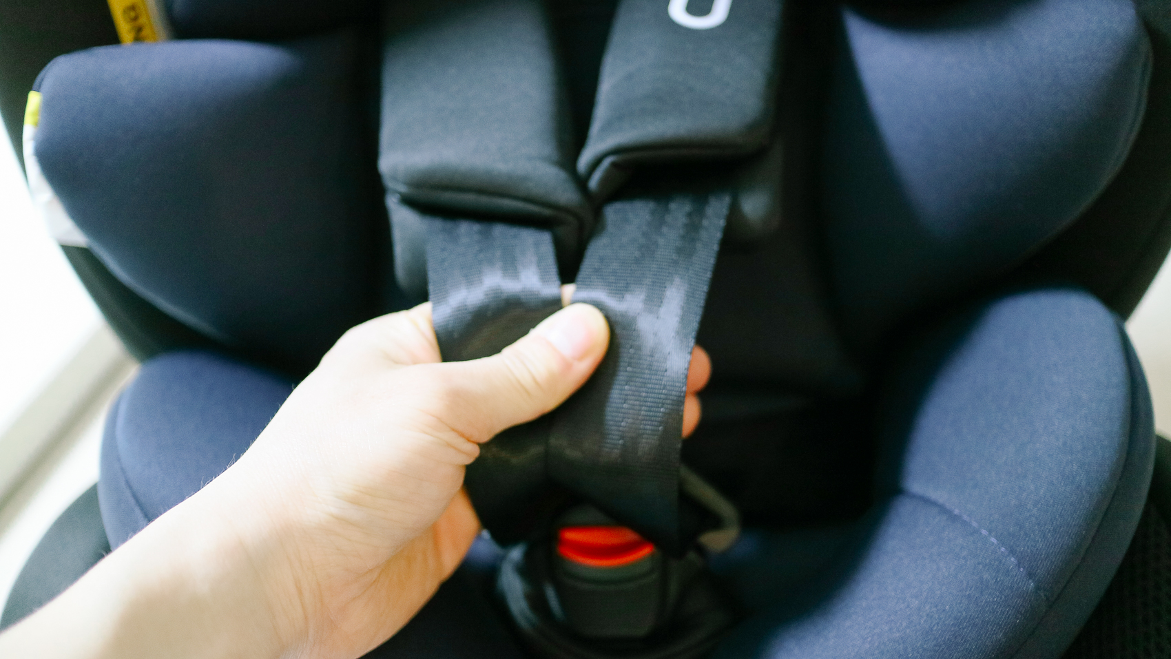 일단 설치전 어깨끈을 최대한 빼주는 모습이다. 사진으로는 손으로 가려서 잘 보이지 않지만 정중앙에 버튼이 존재하고 이를 누른 상태에서 어깨끈을 당기면 늘어난다.