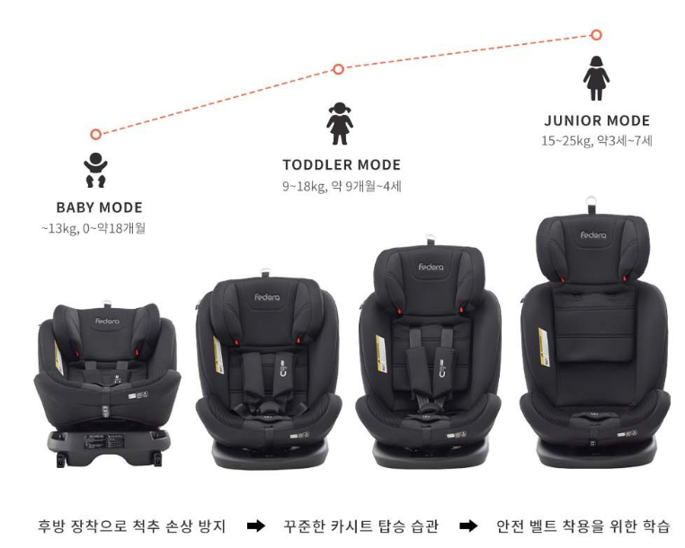 베이비 모드 : 신생아~18개월(0~13kg) → 토들러 모드 : 9개월~만 4세(9~18kg) → 주니어 모드 : 만 3세~만 7세(15~25kg)