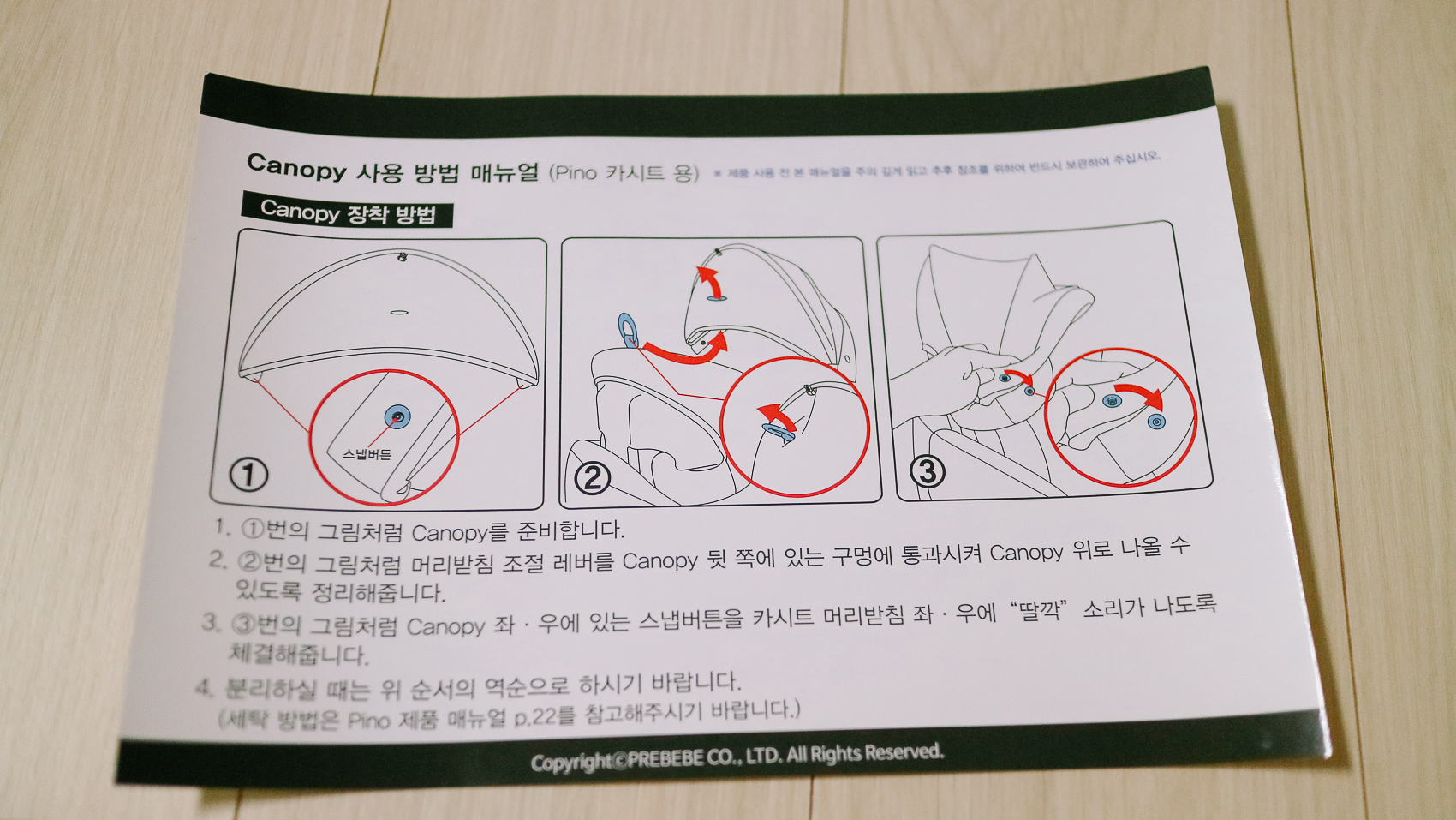 캐노피 장착 방법은 동봉된 메뉴얼을 참고하면 된다. 미사용시 상단에 있는 캐노피 고정 클립에 껴놓으면 된다.