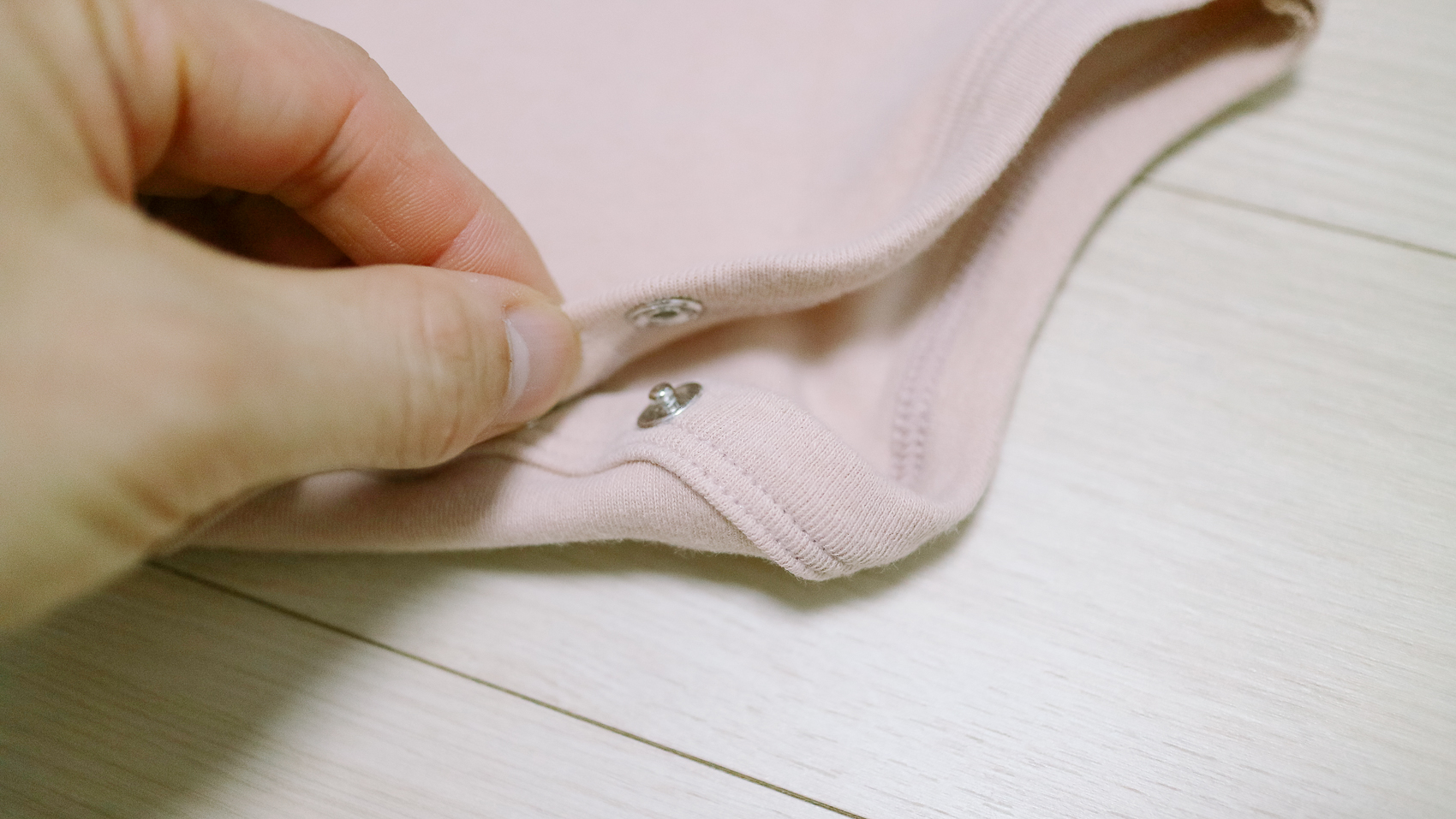 여느 바디수트와 동일하게 하단에는 기저귀 교체가 편리하도록 똑딱이 단추로 마감이 되어 있으며 100% 순면으로 보들보들한 질감과 KC인증, 무형광 시험을 통과한 제품이다.