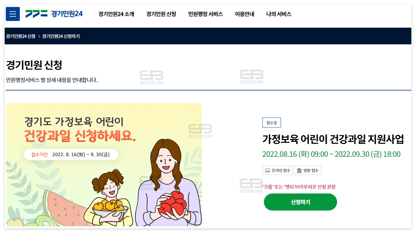 접수중 가정보육 어린이 건강과일 지원사업 2022.08.16 (화) 09:00 ~ 2022.09.30 (금) 18:00 ‘크롬’ 또는 ‘엣지 브라우저로 신청 권장 신청하기