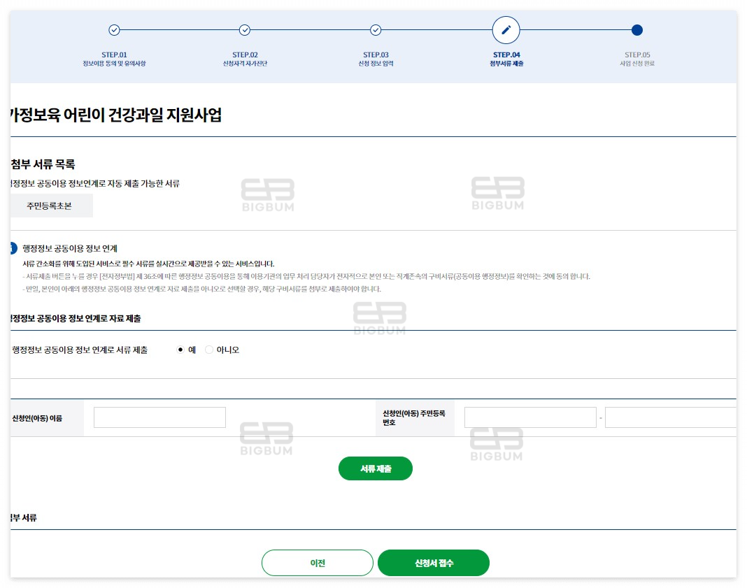 ④ 마지막 4단계 첨부서류 제출. 관련된 정보를 기재한 뒤 행정정보 공동이용 정보 연계로 서류 제출에 예를 클릭하면 별도의 서류 제출 없이 전산상에 조회가 돼서 접수가 된다. 이후 신청서 접수를 클릭하여 가정보육 어린이 건강과일 신청을 완료한다.