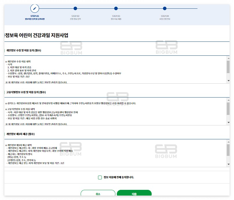 ② 로그인 후 4단계 절차별로 진행하는데, 1단계 정보이용 동의 및 유의사항에 대해서 확인 후 체크를 해준 뒤 다음 버튼을 클릭한다.