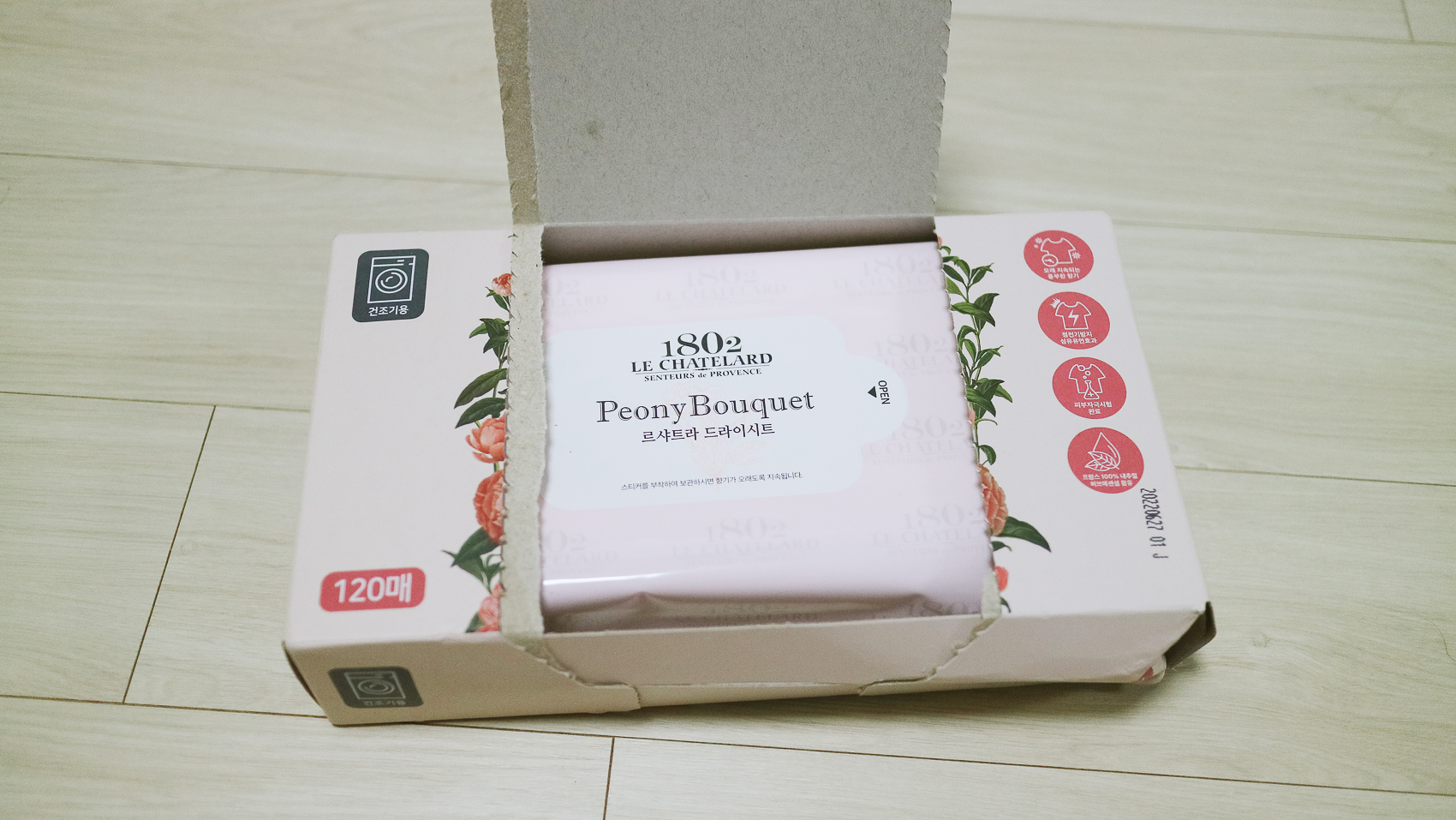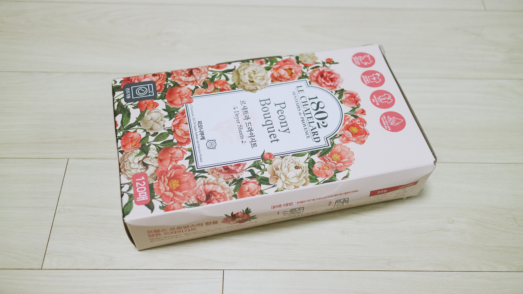 세탁 시 향을 내는 섬유유연제처럼 건조기 사용 시에도 향을 담을 수 있는 드라이 시트가 있다. 그중 생기 넘치고 사랑스러운 느낌의 피오니 작약 부케향이 특징인 르샤트라 드라이스티 피오니 부케를 구매했다.