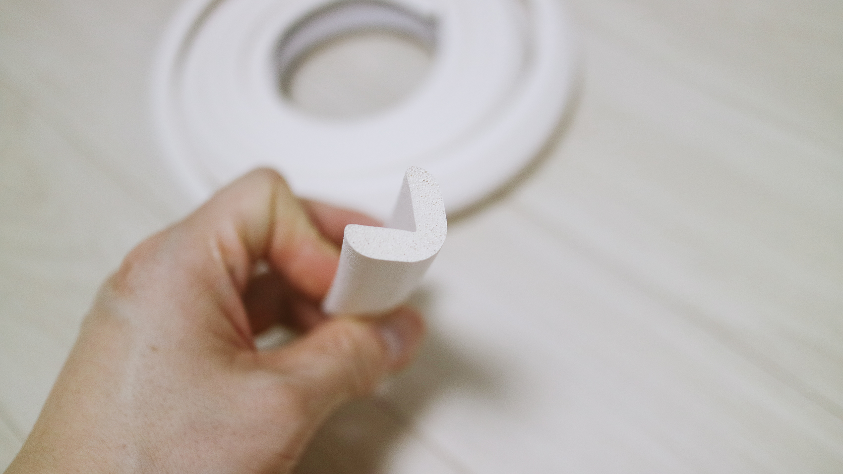 ③첨부되어 있는 양면테이프를 모서리 보호대에 부착 후 5분 뒤 나머지 이형지를 제거