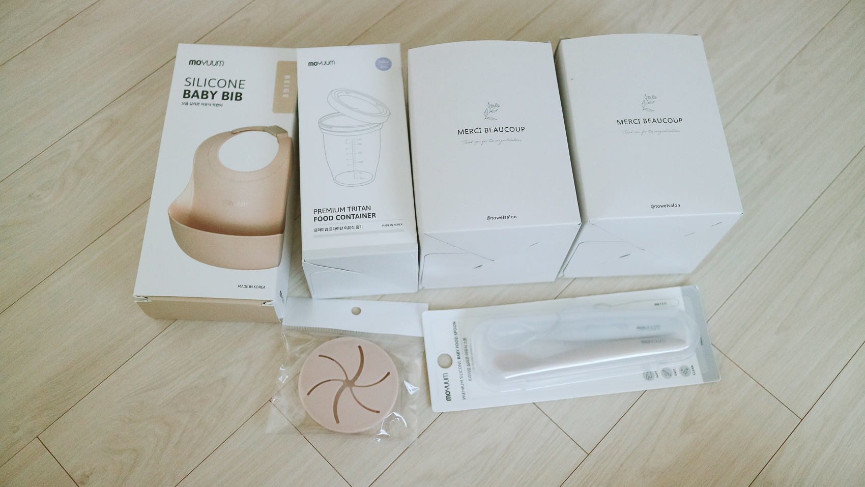 이유식에는 정말 다양한 브랜드와 제품이 있다. 그중 선물로 받은 모윰 이유식 필수 준비물 세트에 대해서 포스팅하고자 한다. 일단 모윰 이유식 필수 준비물 세트 구성으로는 실리콘 이유식 턱받이+이유식 용기 240ml+이유식 스푼으로 구성되어 있다.