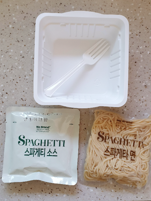 제품은 스파게티 소스, 스파게티 면, 포크, 용기로 구성되어 있다. 조리 방법은 다음과 같다.