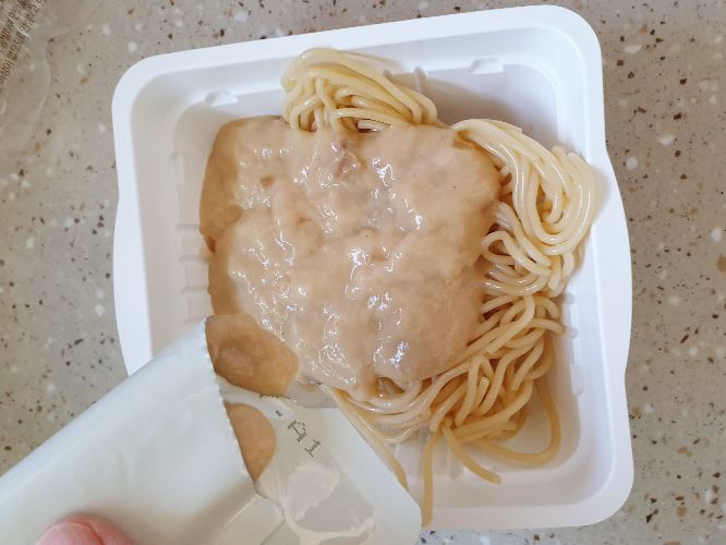 결론부터 말하자면 맛은 기대 이하였다. 굉장히 심심한 맛이었다. 싱거울 정도의 소스. 3개를 구매해서 첫 번째는 그렇게 맛없게 그냥 후루룩 먹어버렸고, 그 이후에 먹은 거는 약간의 소금 간을 해서 먹었다.