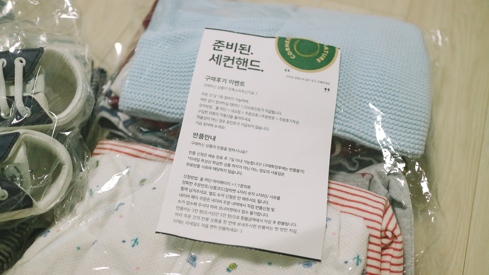 일단 보세 제품이 아닌, 브랜드가 있는 제품만 취급하고 회수 후 깔끔하게 세탁 및 포장을 해주어 배송되기 때문에 아기 유라 의류 같은 경우는 거의 세제품과 다를바 없다. 왜냐면 위에도 언급했듯이 아기 의류 특성상 성장이 빠르기 때문에 몇 차례 입히지 못하고 옷장 속에 자리 잡는 것이 일반적이기 때문이다. 코너 마켓에서 구매한 신발들이다.😍
