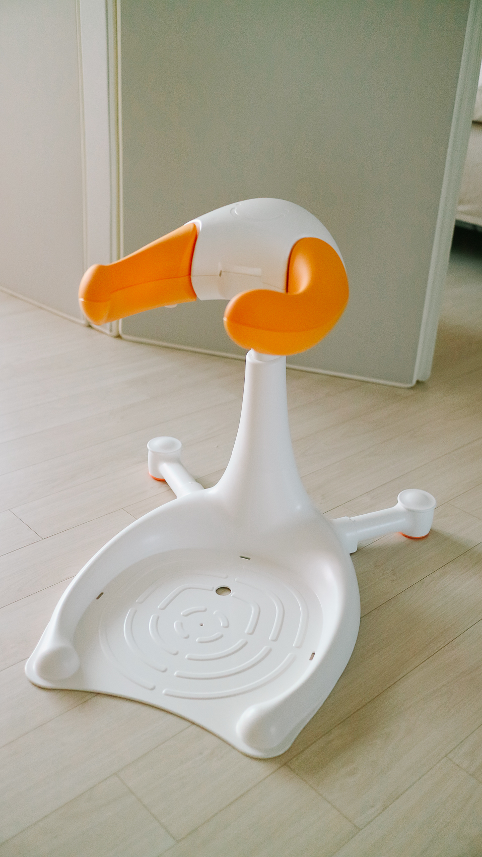 기저귀를 교환할 때도 편리하게 사용할 수 있고, 세운 상태에서 속옷이나 하의를 입힐 때도 사용할 수 있다. 단순 목욕 용품이 아닌 샤워핸들 바닥에 저울을 놓고 체중을 재거나, 막대자로 키를 재어 아기 성장표를 작성할 수 있다.