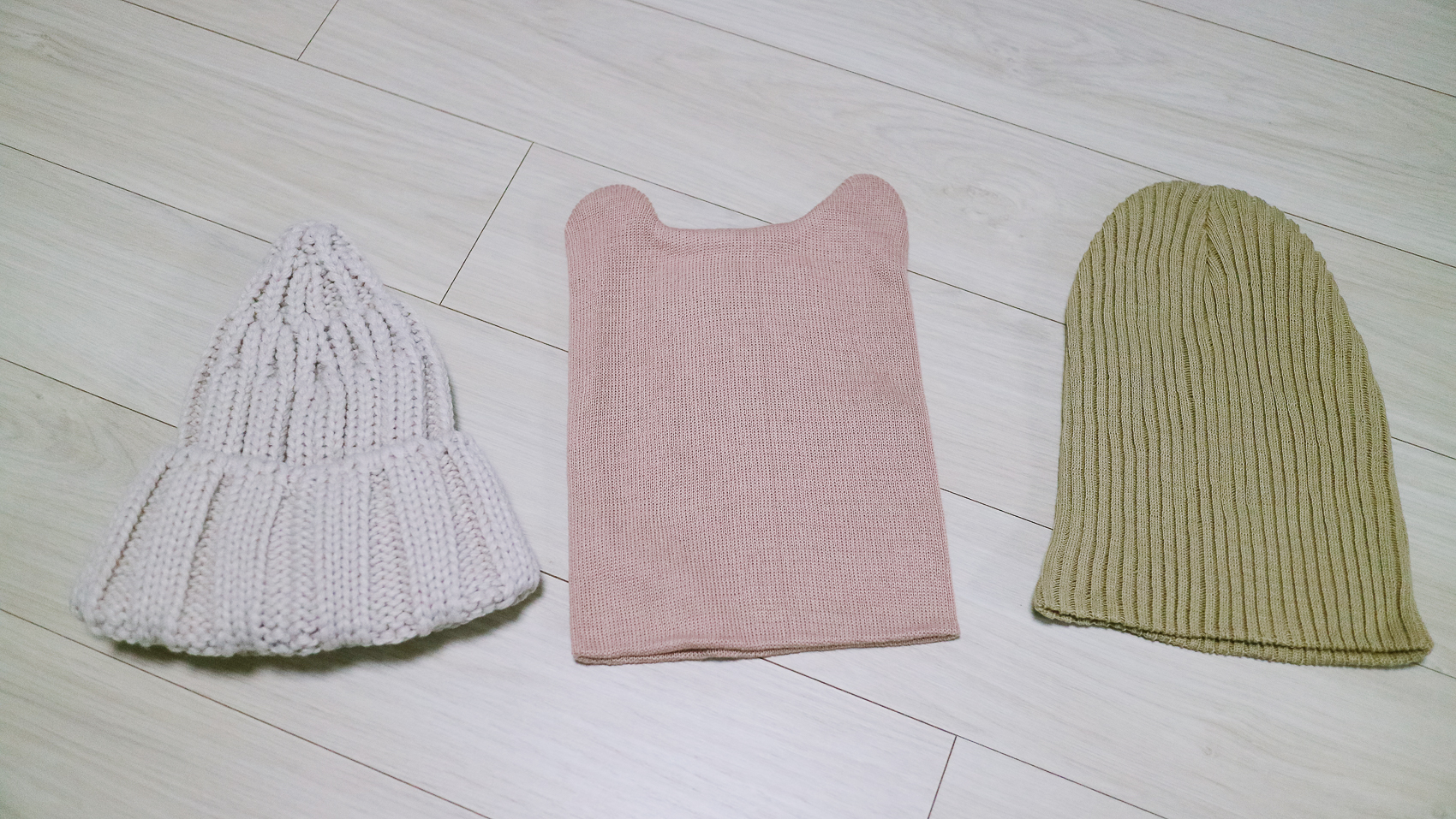 내가 구매한 제품은 왼쪽부터 샌드 니트 아기 비니-밀크베이지, 베베 악마 비니-핑크, 스타일 골지비니-베이지이다.