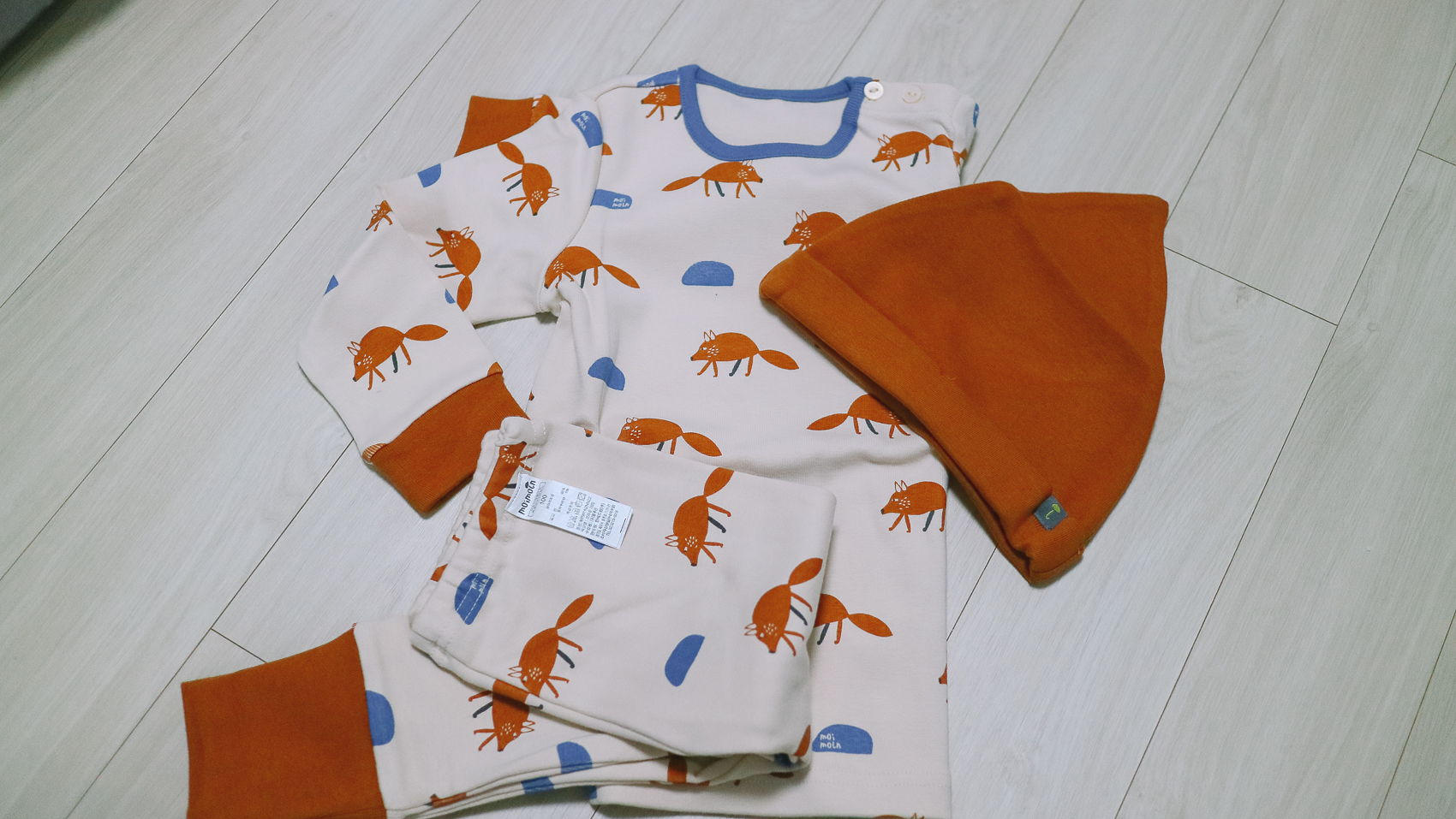 제품은 귀여운 여우 그림이 그려져 있는 것이 특징이며, 모자와 함께 세트라 굉장히 장난꾸러기 스타일을 연출할 수 있다.