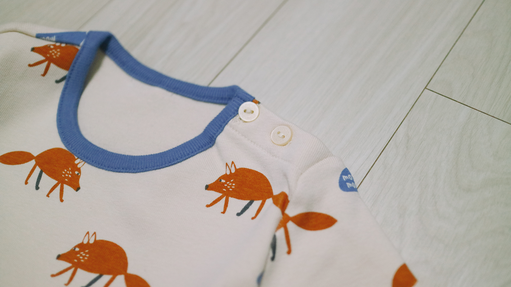 넥 라인에는 블루톤으로 포인트를 주었으며, 옆트임 단추로 옷일 갈아입힐 때 편리하다. 도톰한 두께감과 부드러운 소재를 사용하여 아이들의 피부를 자극하지 않도록 했다.