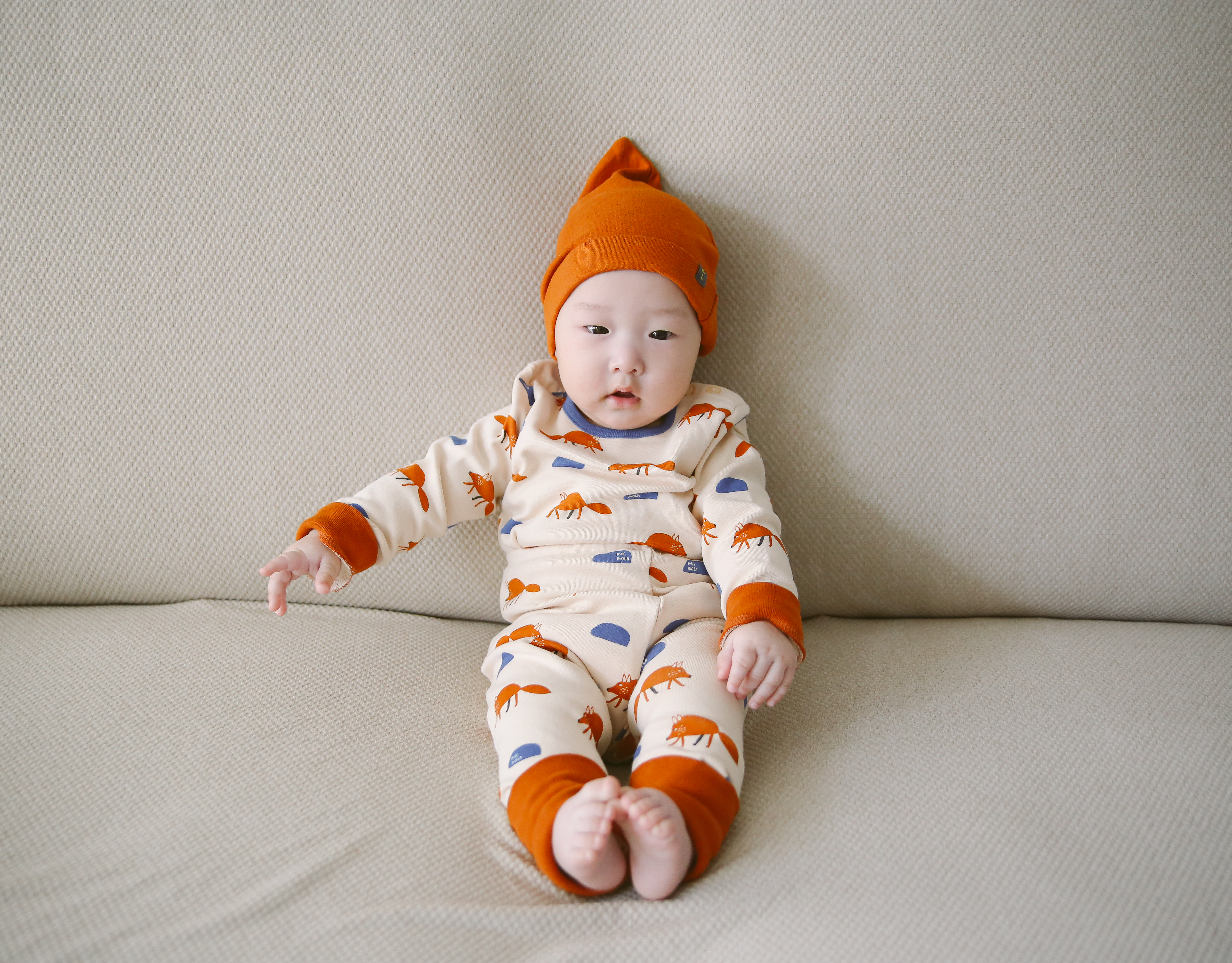 벌써 5개월 전 모습이다. 넉넉한 사이즈로 구매해서 밑단, 소매를 접어 올려 입혔음에도 정사이즈 입은 것 같은 느낌이다. 비니 덕분에 굉장히 귀여우면서도 장난 꾸러기 같은 이미지를 준다.