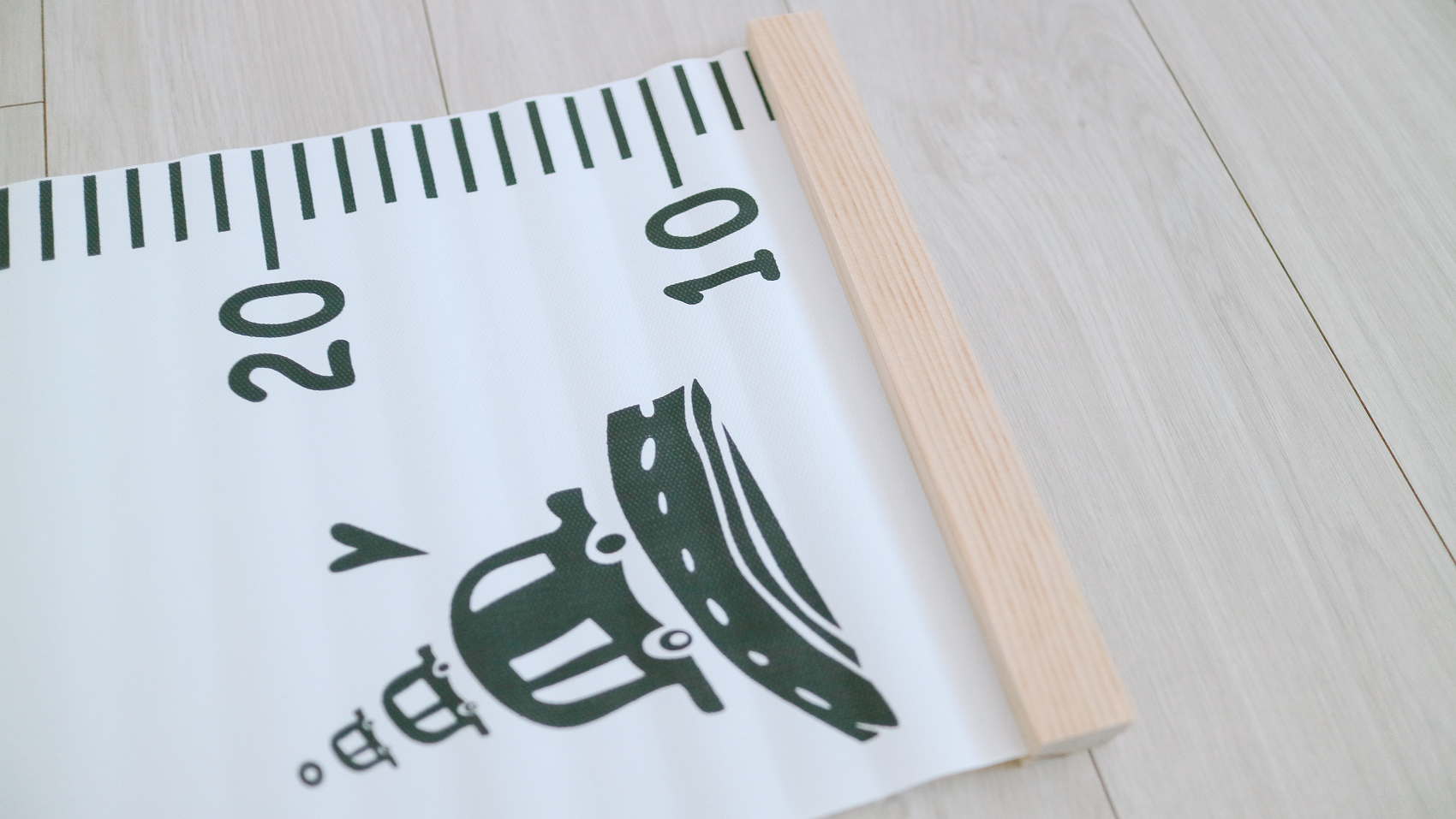 상단 우드프레임에는 벽걸이가 용이하도록 끈 처리가 되어 있다. 앞서 말했듯이 벽면 하단에는 대부분 걸리받이로 마감되어 있어 0cm부터 측정하는 키재기 자는 없고, 일정 높이 이상부터 측정하는 키재기 자들 중 10cm 미만부터 측정할 수 있는 것은 북유럽스타일 패브릭 키재기 자가 유일했다.