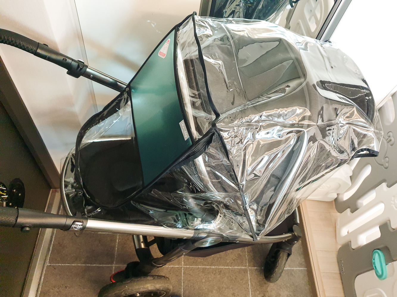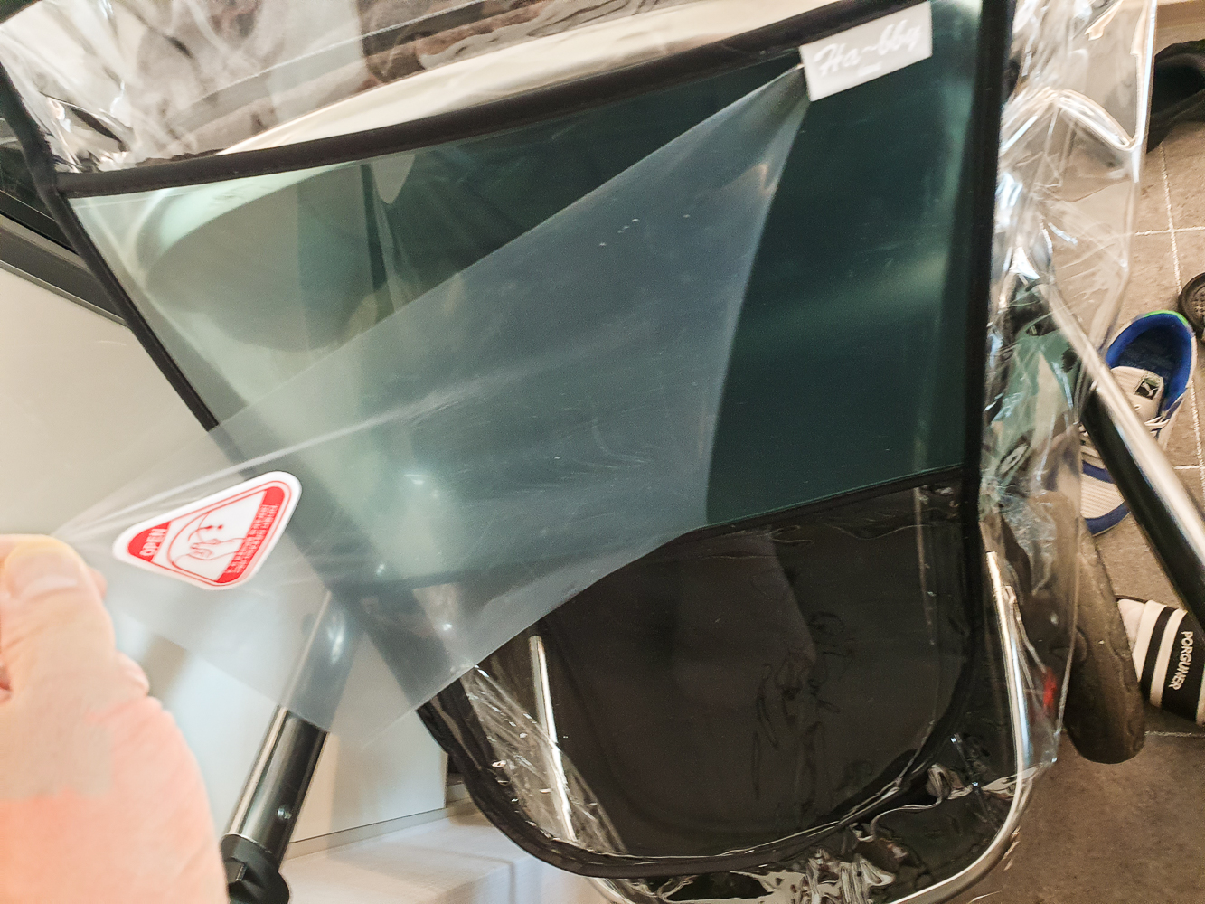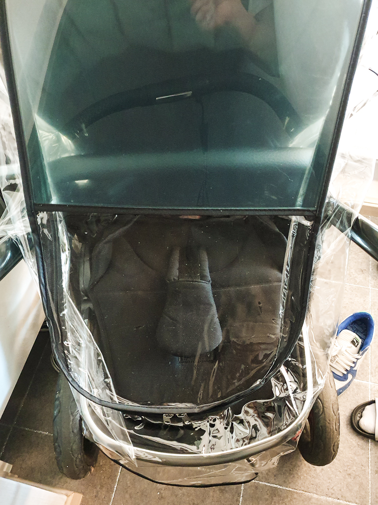 일단 제품을 수령하고 유모차에 맞는지 걸쳐봤다. 다행히 잘 맞아서 시야창에 붙어있는 보호필름을 제거했다. 유모차에 잘 맞는지 확인 후 보호필름을 제거할 것을 권장한다. 왜냐면 보호필름을 제거하면 반품이 불가하기 때문이다.