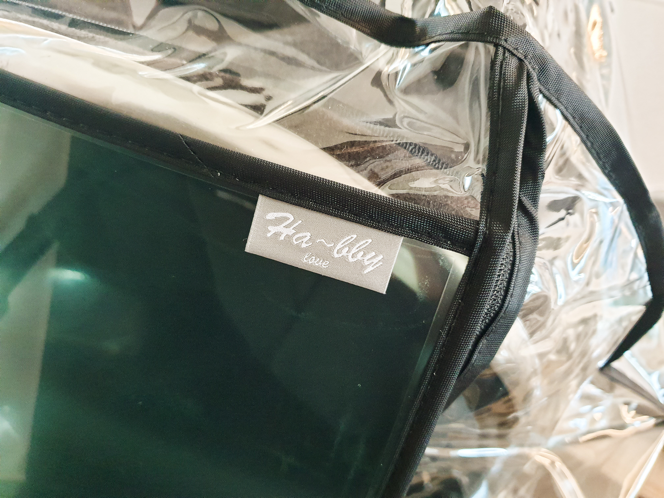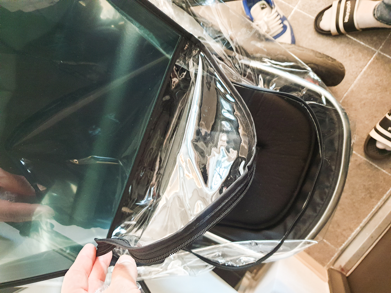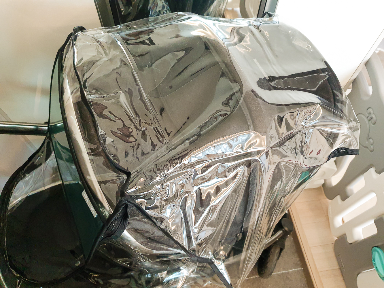 일단 제품을 수령하고 유모차에 맞는지 걸쳐봤다. 다행히 잘 맞아서 시야창에 붙어있는 보호필름을 제거했다. 유모차에 잘 맞는지 확인 후 보호필름을 제거할 것을 권장한다. 왜냐면 보호필름을 제거하면 반품이 불가하기 때문이다.
