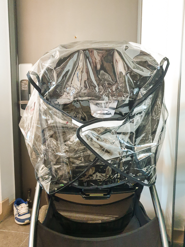휴대용 유모차 레인 커버는 절충형, 휴대용, 디럭스 타입의 유모차가 모두 호환이 되는 것이 가장 큰 특징이다. 유모차 전체를 넉넉히 덮어주는 모습이다. 하단의 수납공간까지는 기장이 닿지 않지만 아이가 타고 있는 상단 쪽은 전부 커버를 해주고 있는 모습이다.