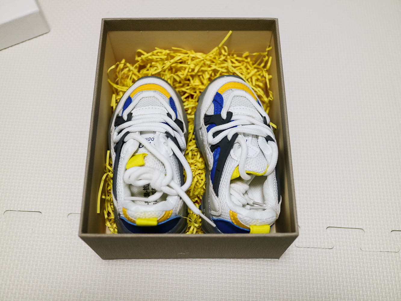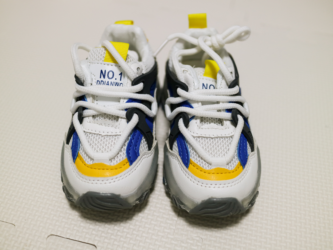 아내 친구가 놀러 왔을 때 아들 선물로 사준 신발! 전체적으로 흰색 매쉬 타입에 노란색, 파란색, 검정 컬러로 포인트가 되어 있어서 깔끔한 디자인이다.