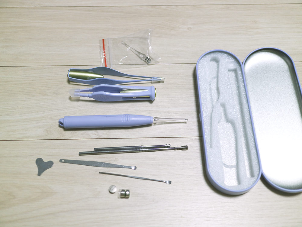 스프링, 나선형, 평두 귀이개 2종의 다양한 툴로 편리하게 사용자에 알맞은 형태로 귀지를 제거할 수 있다. 다양한 구성품과 함께 보관케이스도 함께 구성되어 있어 여행 및 외출 시 콤팩트하게 휴대가 용이한 제품이다.