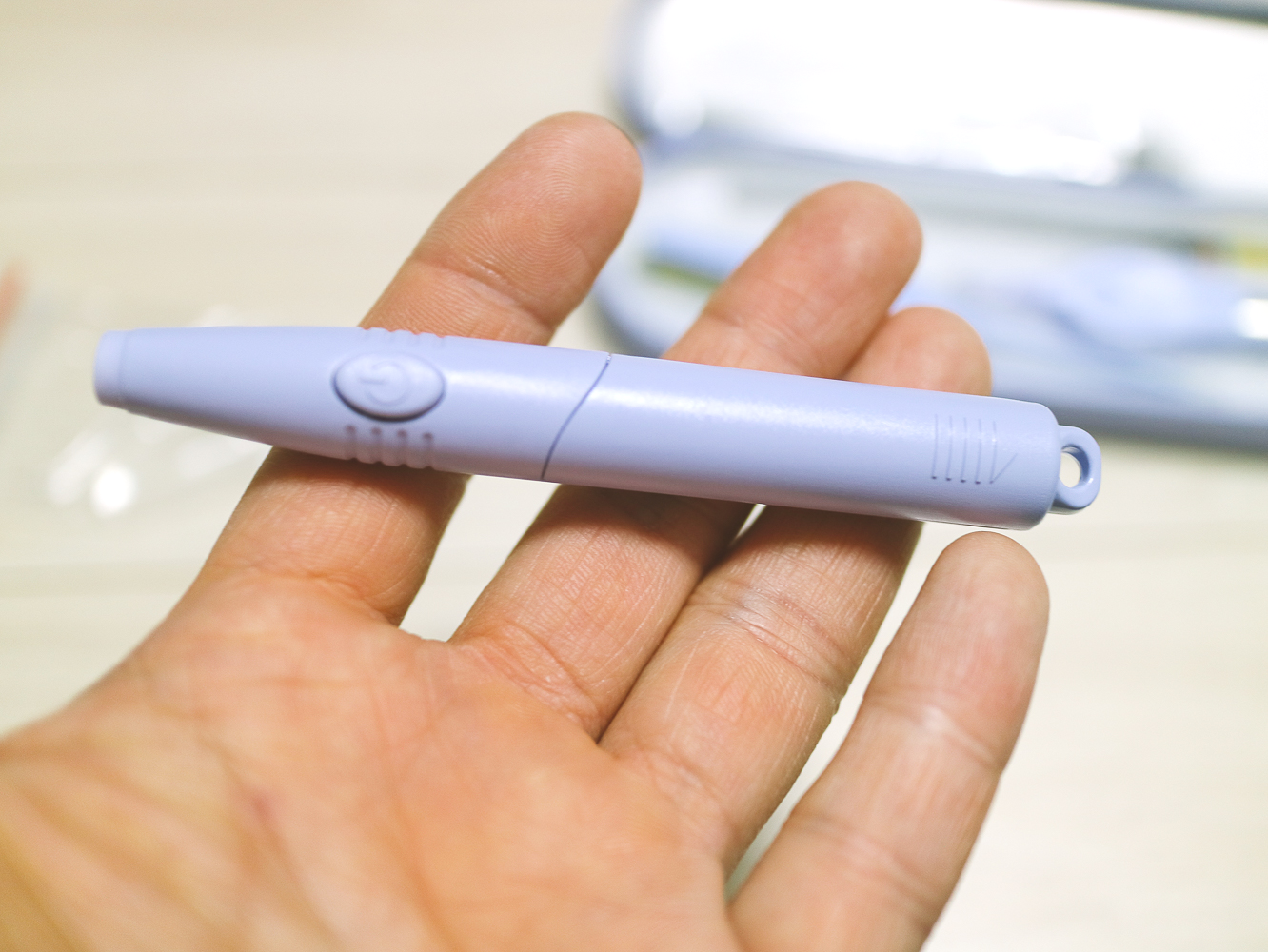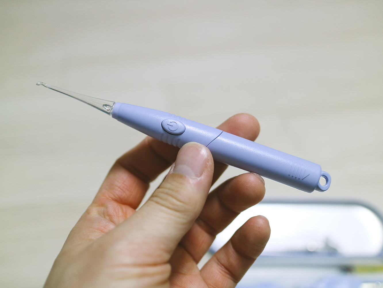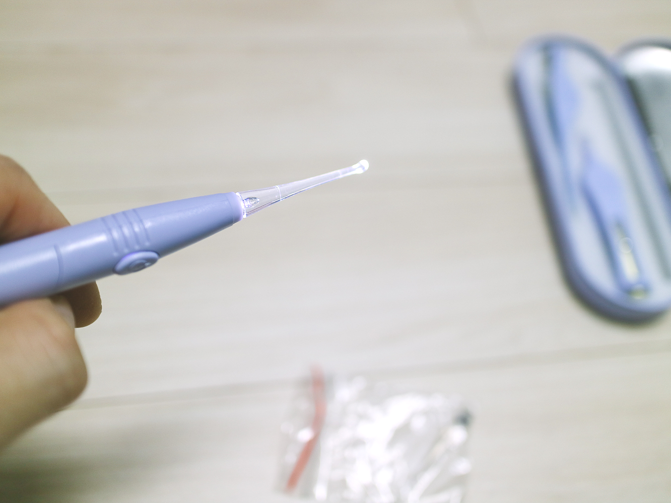 비타할로 LED 이어클리너 헤드가 결합된 모습. 이중 고리형 완충 장치가 힘을 분산하여 아프지 않게 제거가 가능하다. (※사용연령은 만 14세 이상)