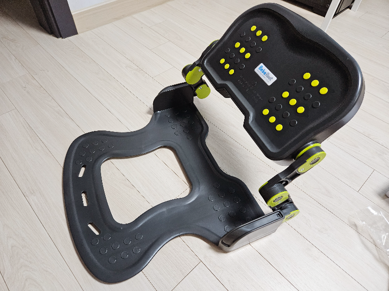 좌우측에 보여지는 연두색 원형 부분이 다 각도조절이 되기 때문에 아이의 다리 길이 높이에 알맞게 조절하기 용이하다. 또한 걸림쇠 부분이 있다 보니 고정된 각도는 견고하게 유지되는 형태이다.