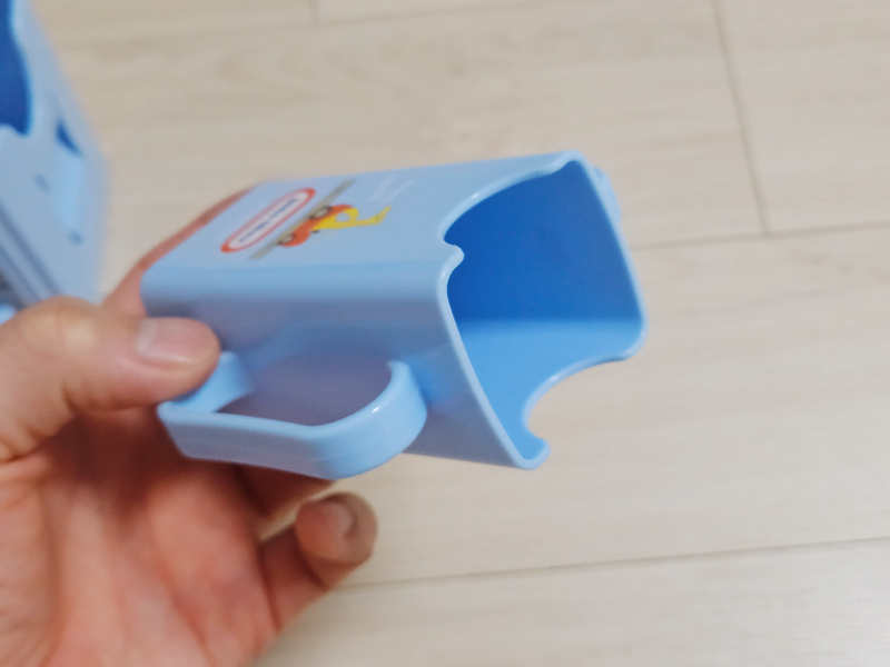 밑바닥은 막혀 있어 125ml 용량 팩 음료를 넣으면 딱 안정감있게 잡아주어 아이가 힘을 가해도 음료가 나오지 않고 편리한 그립감으로 아이가 스스로 먹을 수 있도록 유도해 준다.