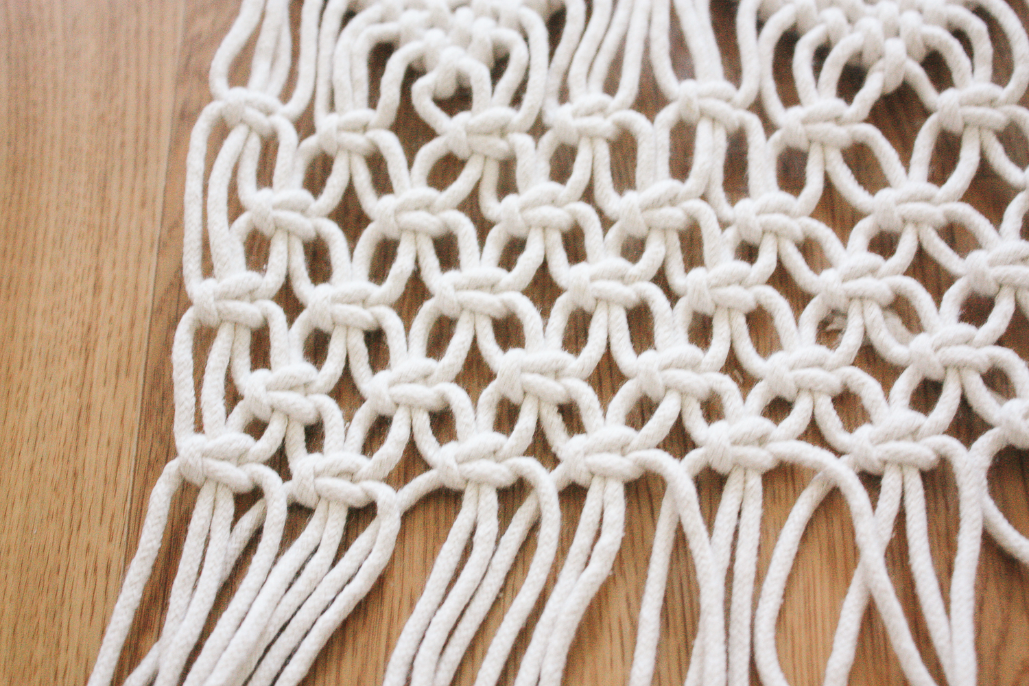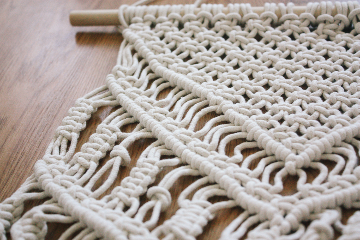 이것은 가드닝 마크라메 월행잉 모습, 상단의 역삼각형 매듭과 짜임새가 특징인 디자인이다.