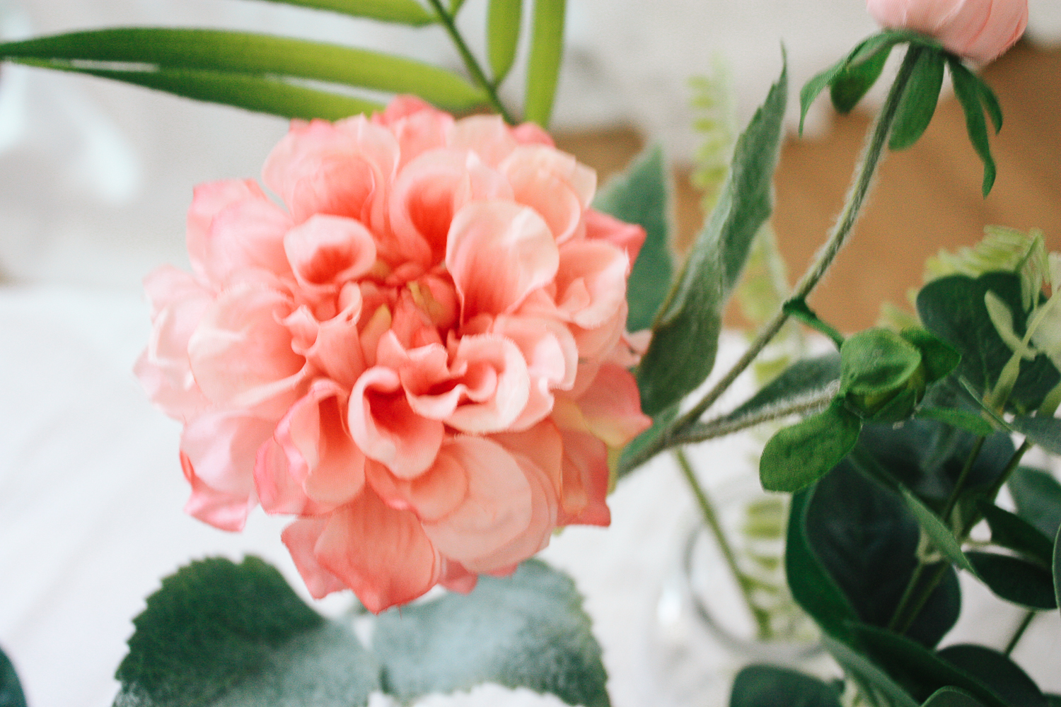 조화는 폴리안 유카리 부쉬, 아레카야자 잎 (M), 디알리아 3종에서 핑크 색상을 구매하였다.