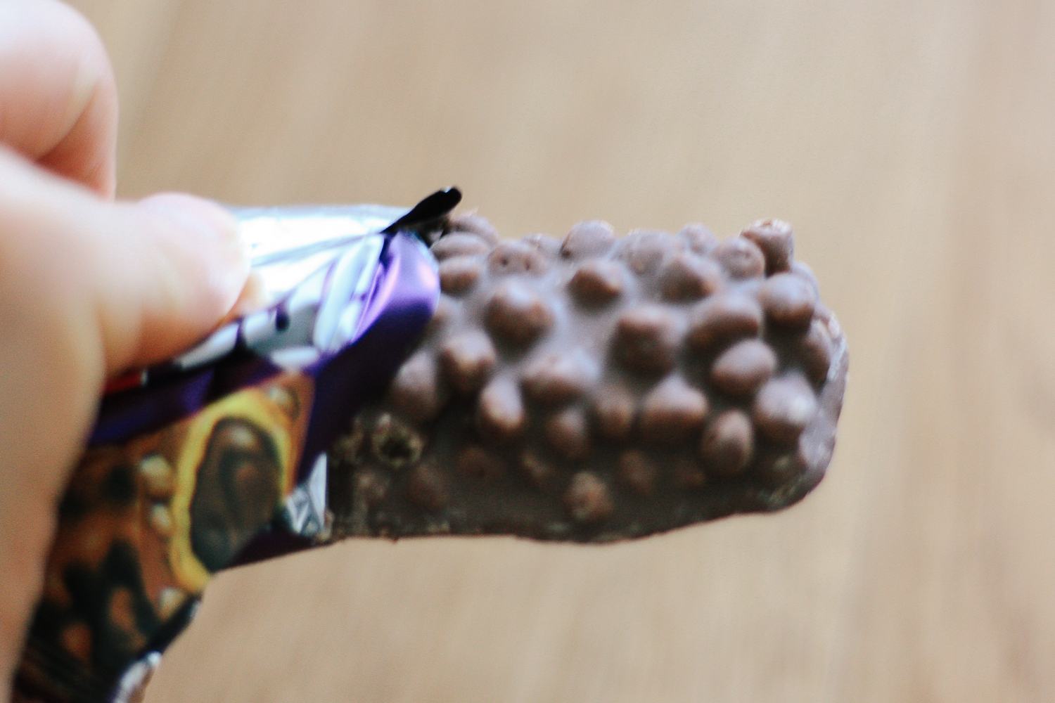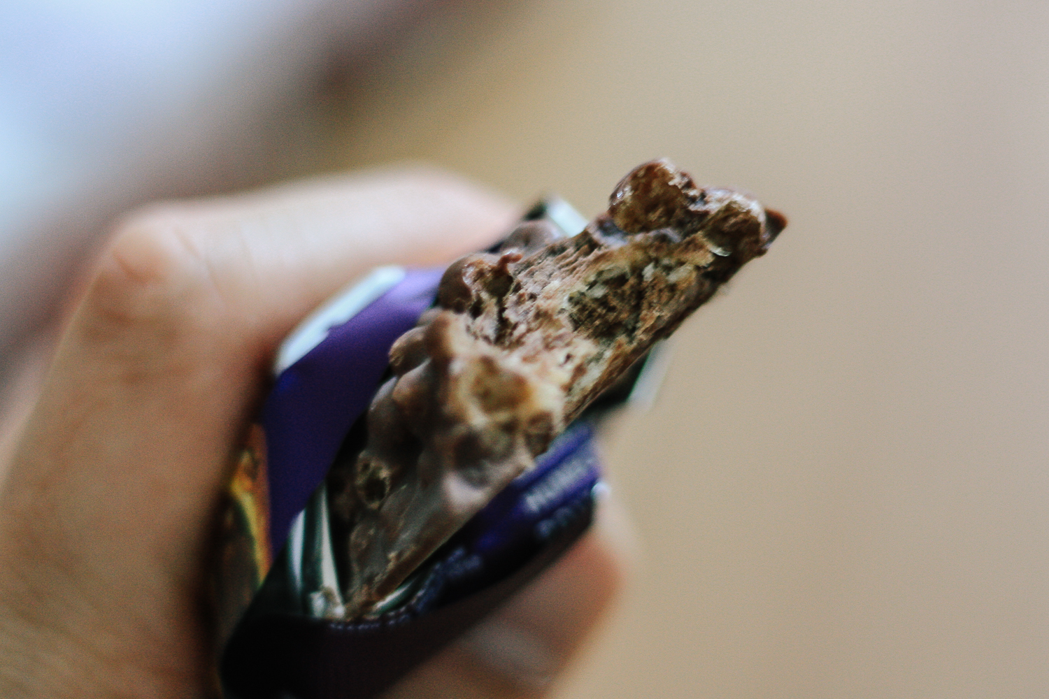 한입 베어먹은 모습 내부 중앙에는 초코가 들어있고 그 외는 시리얼 과자로 바삭한 식감을 느끼게 해 준다.