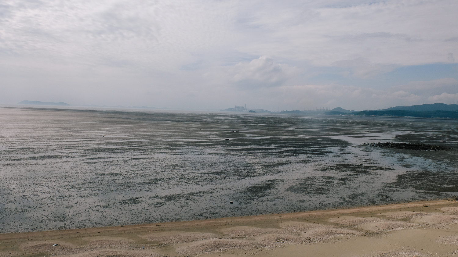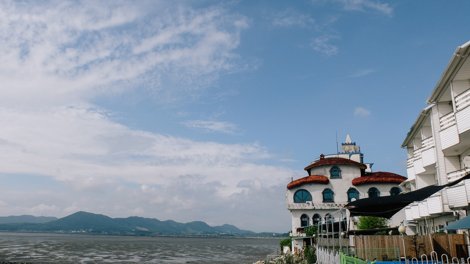 안쪽에 위치한 마당에서 보이는 뷰. 물이 빠진 바다 모습이다. 오전 내내 흐렸다가 오후에 햇빛이 떠서 멋진 풍경을 담을 수 있었다.