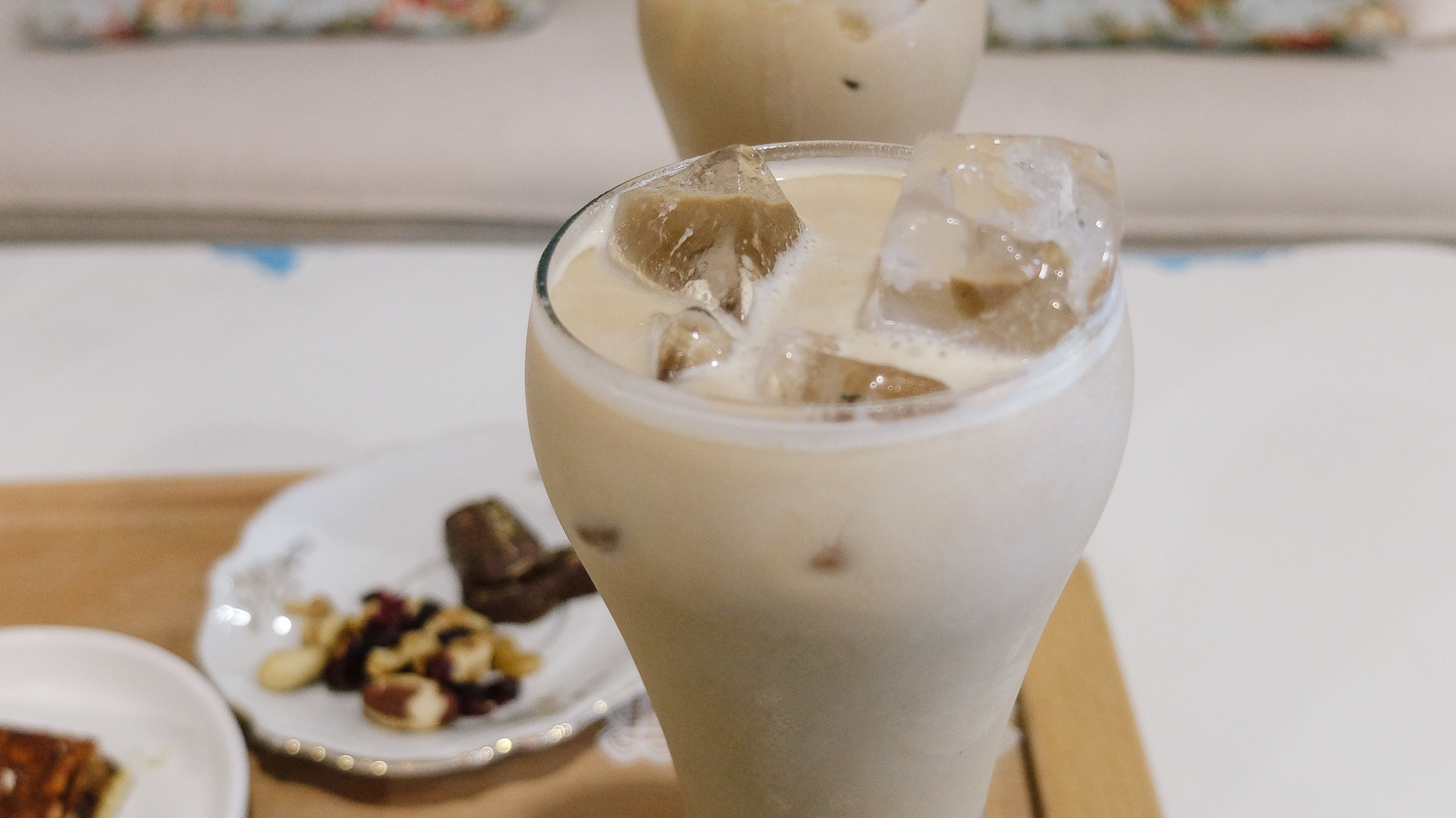 우리가 주문한 호두파이와 아이스 카페라테. 덤으로 소소한 견과류, 다과를 주셨다.