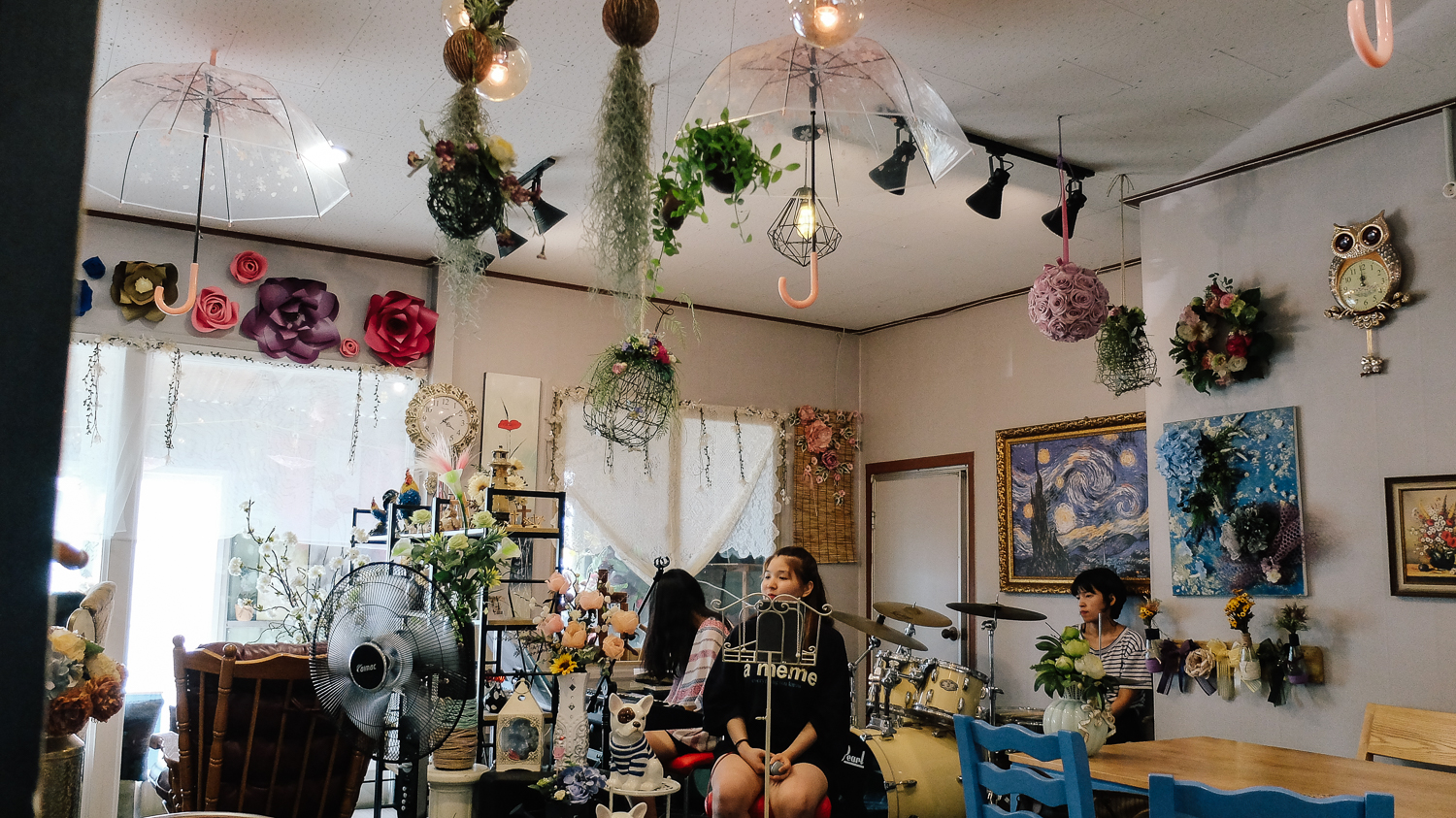 그리고 천장에 다양한 조명과 우산이 보였다. 동화 속에 있는 듯한 모습