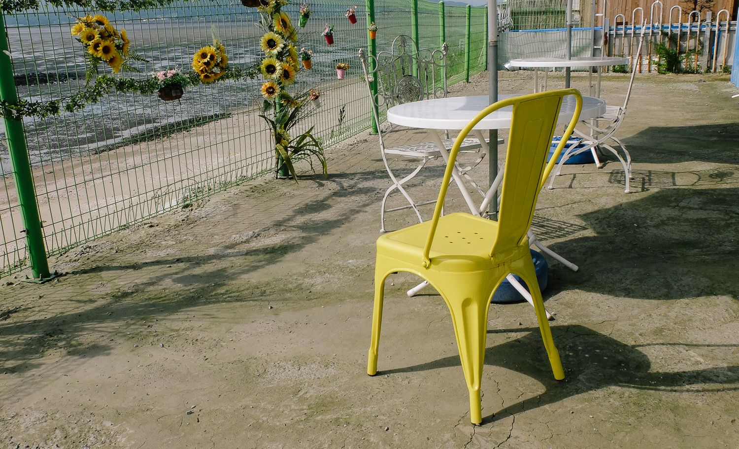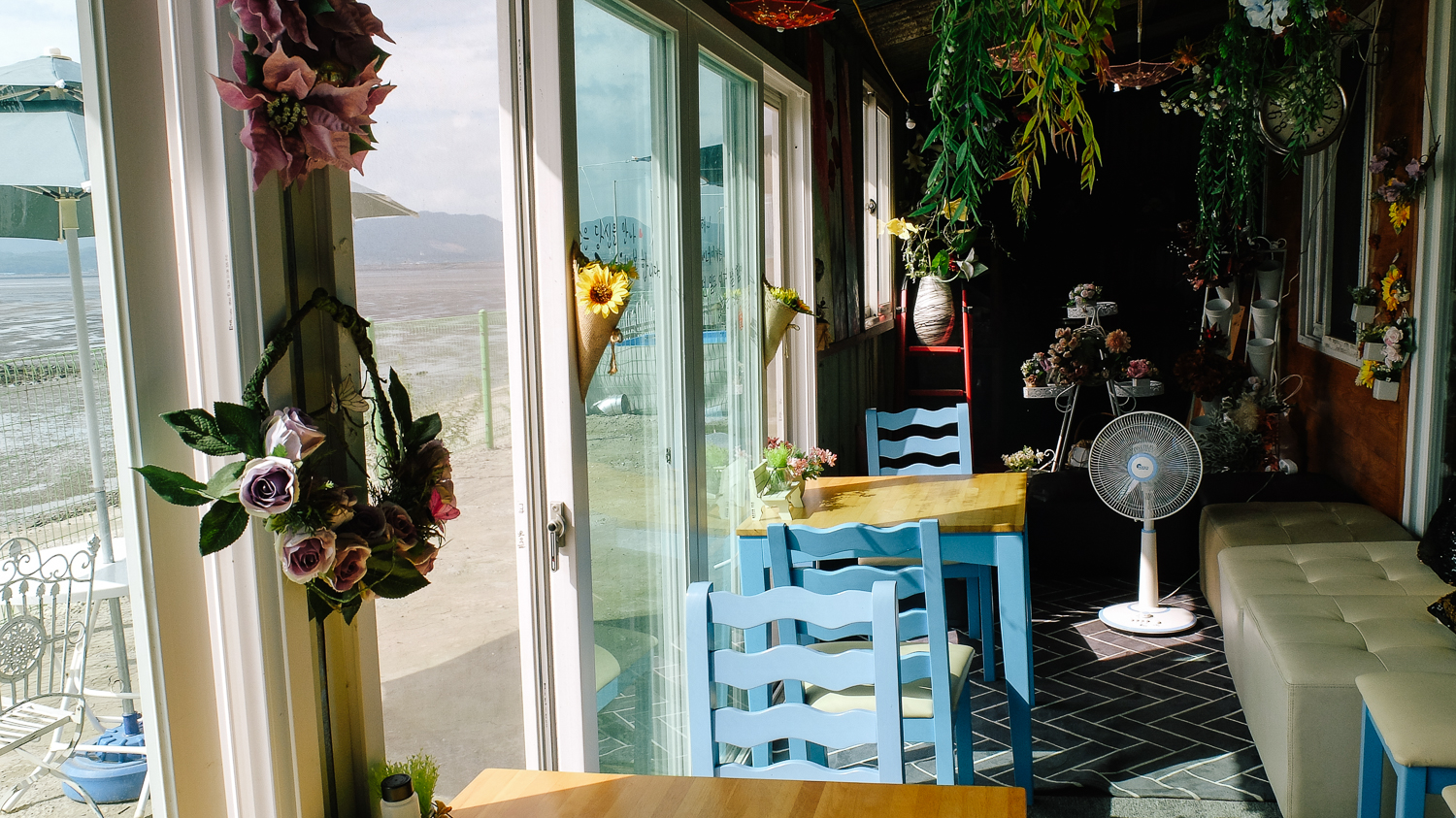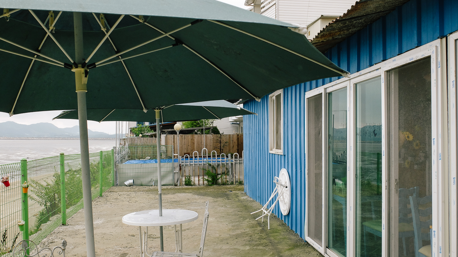 여기는 안쪽에 위치한 작은 마당. 이곳에도 파라솔 테이블이 2개나 자리해 있었다. 중간중간 파란색 포인트 컬러가 돋보인다.