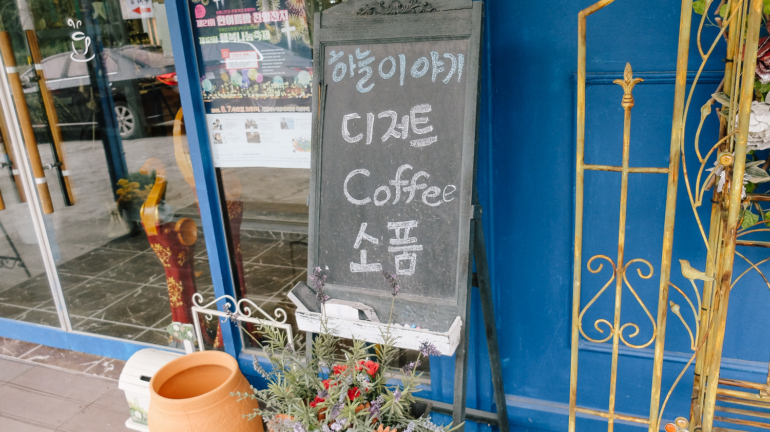 날씨가 우중충했음에도 불구하고, 짝꿍이 며칠 전 다녀왔던 아기자기 소품이 가득 있다는 하늘이야기 카페를 방문하게 되었다. 처음 봤을 때 하늘이야기라는 카페 이름에 어울리는 파란색으로 포인트를 준 카페 모습이 눈이 띄었다.
