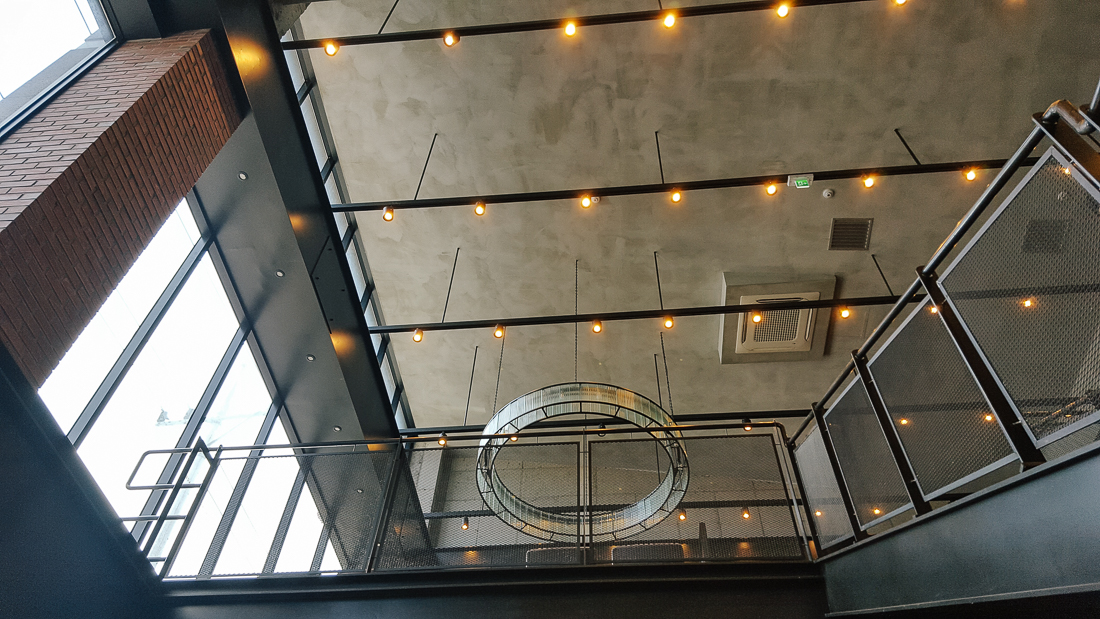 1층에서 바라본 천장에 보이는 조명들. 큰 원형 조형물과 레일 조명 전구가 묘하게 어우러지는 모습!