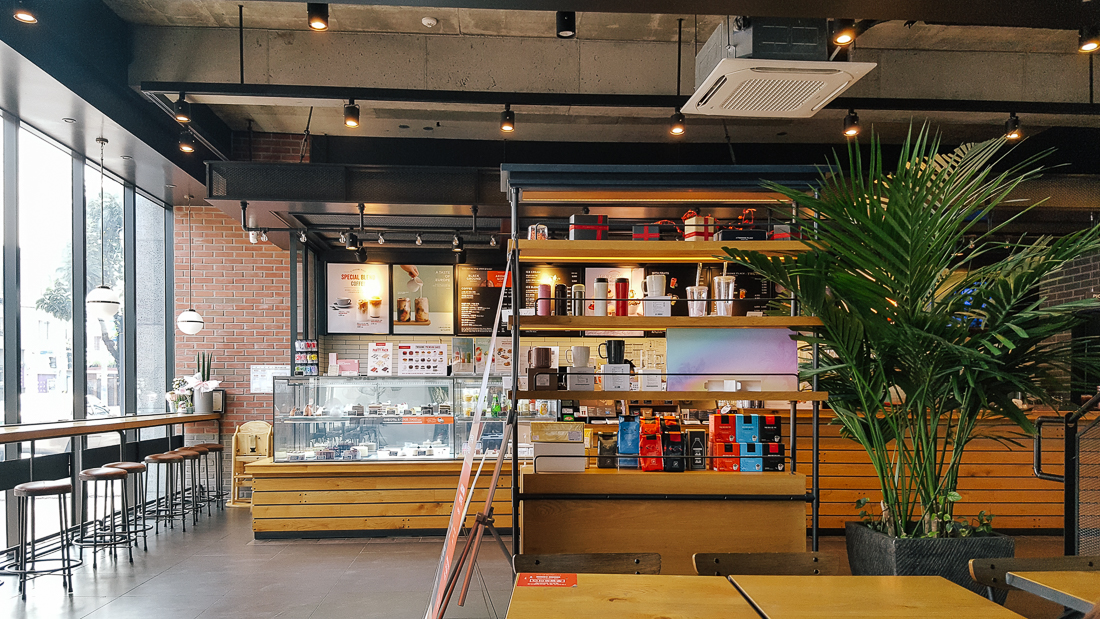 중간에 원목합판을 사용하여 벽면을 연출한 모습이다. 투썸플레이스의 타이포그래피로 포인트를 준 모습이다. 덕분에 같은 공간이지만 색다른 느낌을 준다.