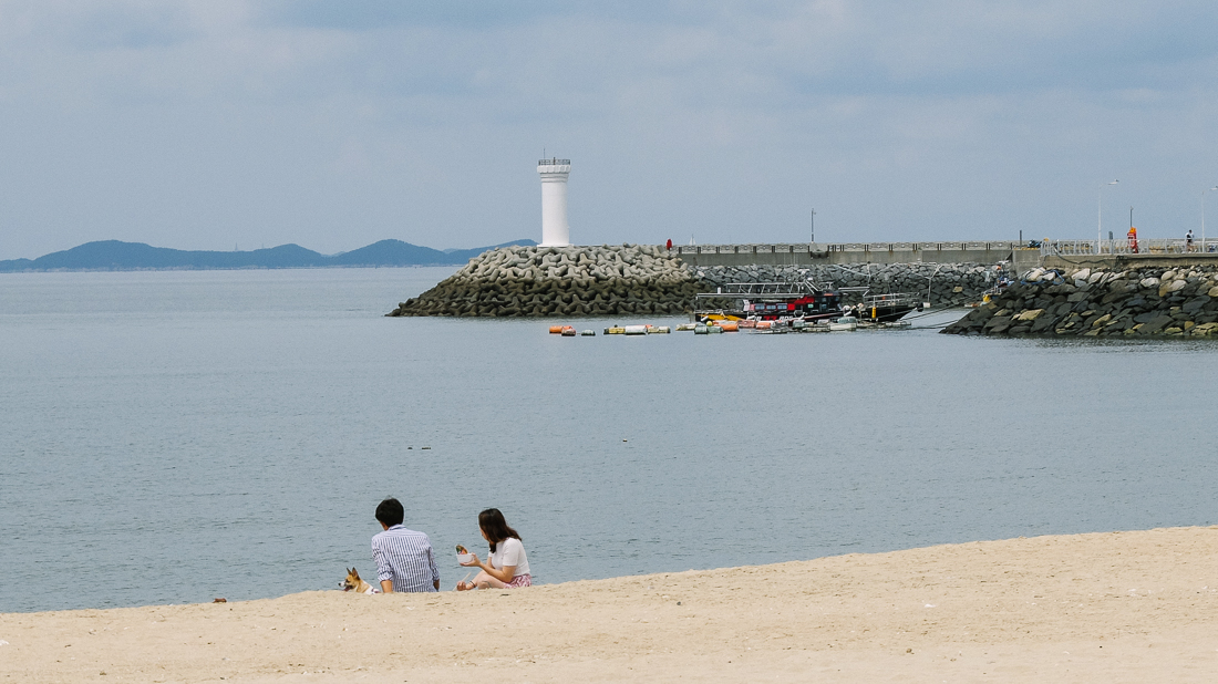 한참을 걷다가 짝꿍의 레이더망에 걸린 한 커플. 반려동물 강아지와 함께 돗자리를 깔고 바닷가 풍경을 즐기며 식사를 하고 있었다. 저 커플은 알고 있을까. 본인들의 모습이 한 폭의 그림과도 같다는 것을.