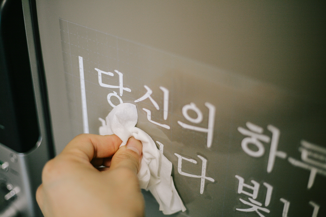 스티커 부착 전 미리 부착하고자 하는 곳을 깨끗이 한번 닦아내어 접착이 잘 될 수 있도록 준비작업을 한다.