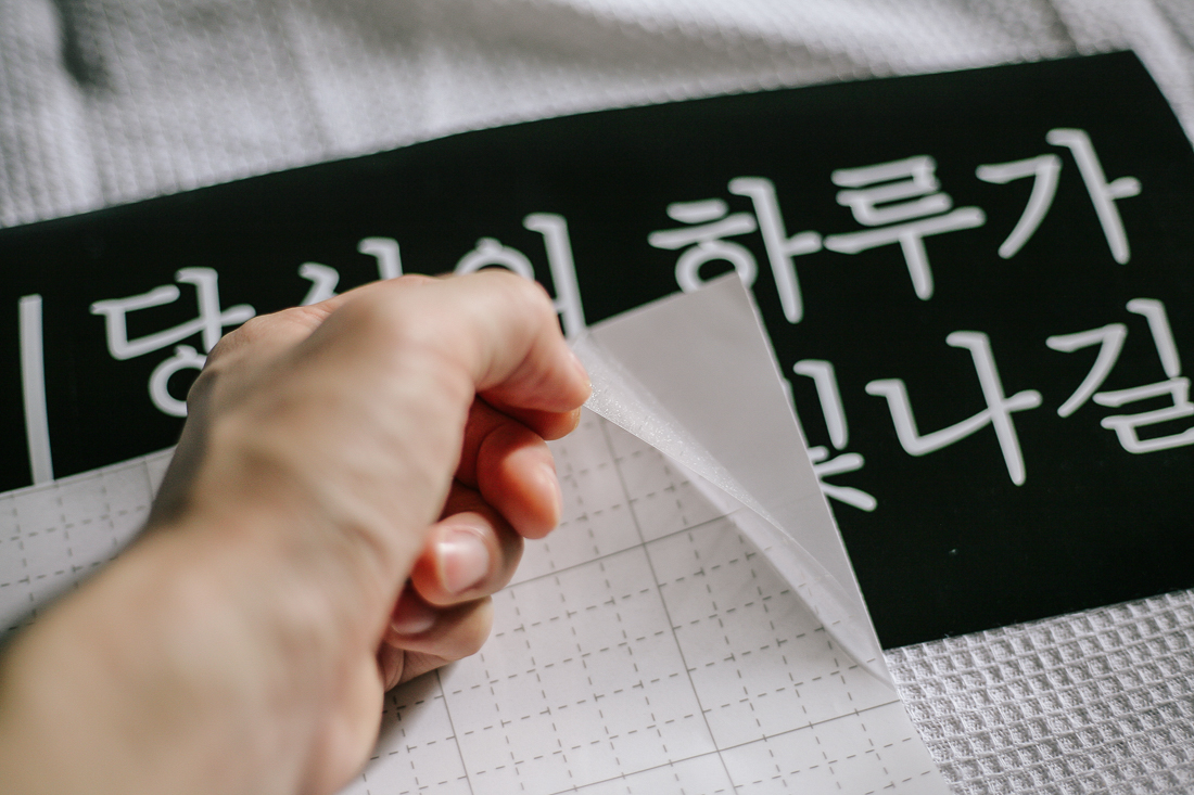 어느 정도 꾹 눌러줬다 싶으면 살살 투명 보조 시트지를 천천히 떼어낸다.