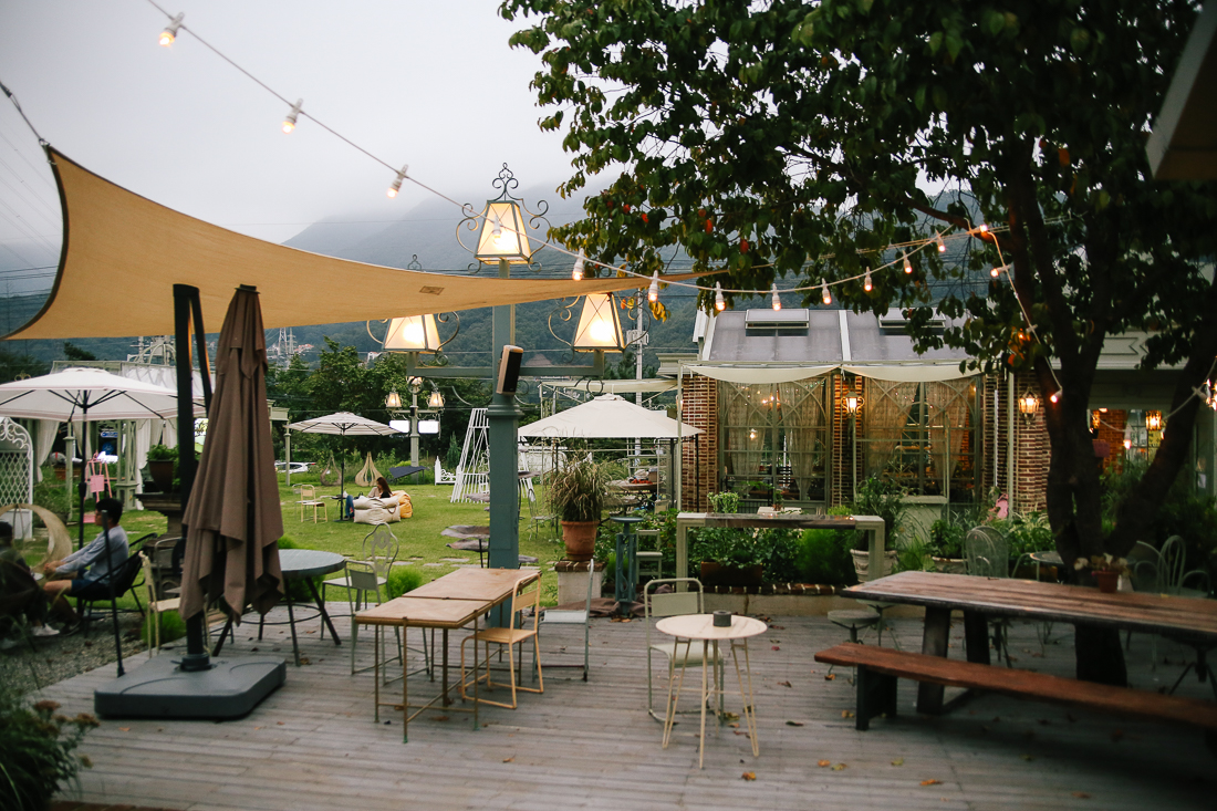 느린 정원 카페 내부 전경. 전구색의 따뜻한 조명이 곳곳에 밝혀있어 포근한 느낌을 주고 있다. 그리고 원목 테이블 및 의자가 있어 더욱더 따듯한 느낌을 준다.