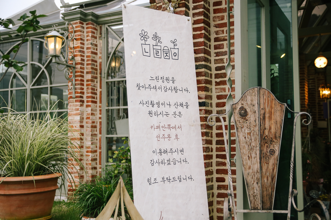 아무래도 주문없이 정원 쪽만 휙 둘러보고 가는 방문자가 더러 있는 모양이다. 입구 앞쪽에 사진 촬영이나 산책을 원하시는 분들은 카페 내에서 선주문 후 이용하라는 안내 배너가 있다.