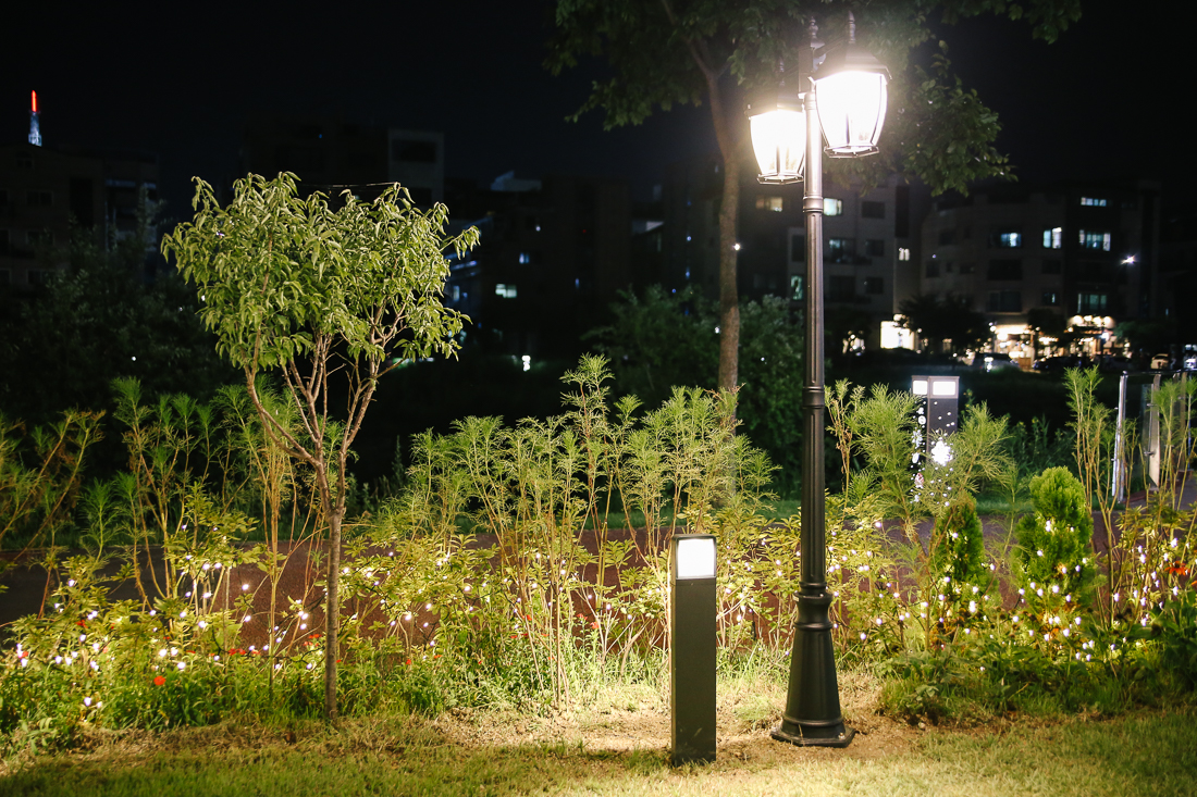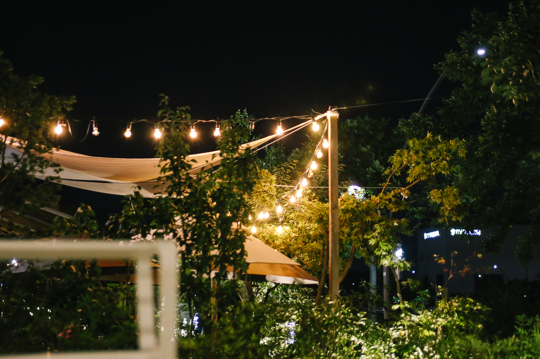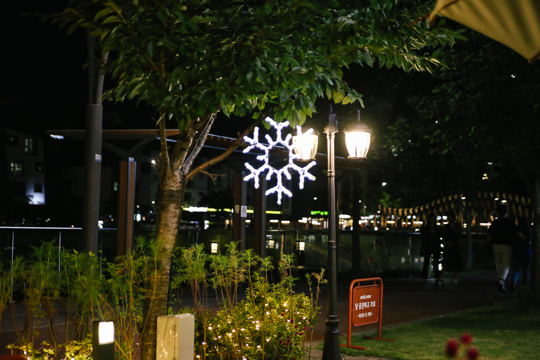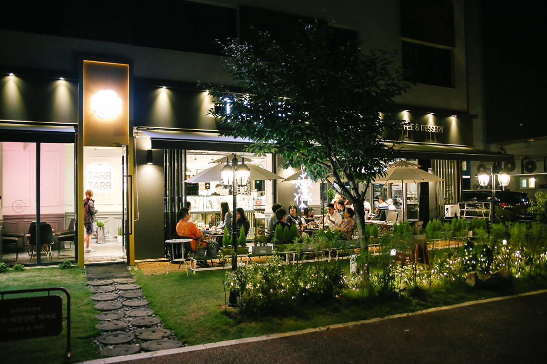 산책로에서 바라본 별내 TARR TARR 카페 전경. 연휴 날 저녁임에도 많은 카페들이 영업을 하였고, 덕분에 각 카페의 조명 때문에 더욱더 분위기 있게 산책로를 다닐 수 있었다.