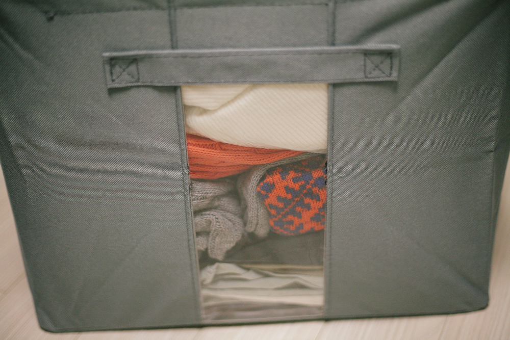 전면부 투명비닐로 보이는 디얼 리빙 다용도 수납 리빙박스 내부. 대략적으로 어떠어떠한 의류가 있구나 하면서 추측할 수 있다. 지저분해 보이거나 깔끔해 보이지 않는다면 뒤로 돌려서 수납하면 된다.