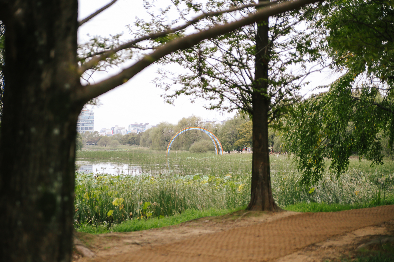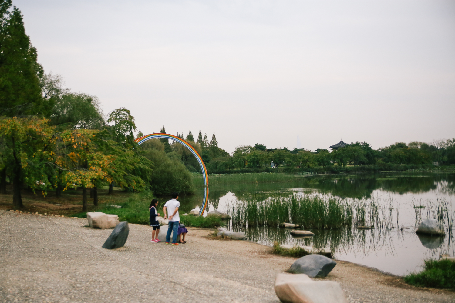 멀리 보이는 무지개 조형물도 연못에 비쳐 굉장히 멋진 풍경을 자아냈다. 더 맑은 날씨였으면 예뻤을 텐데 아쉽다.