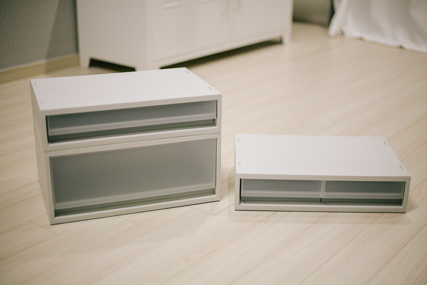 차례대로 쌓아놓은 데스크 정리함. 내가 주문한 것은 데스크 서랍장 낮은형 1칸, 데스크 서랍장 낮은형 2칸, 데스크 서랍장 높은형 1칸이다.