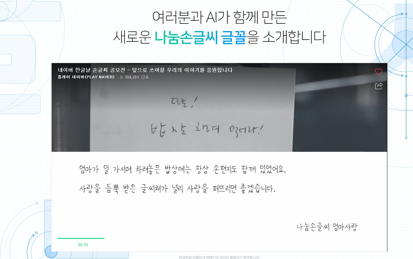 네이버 클로바 메인 페이지 화면, 나눔손글씨 글꼴에 대한 간략한 소개글과 영상이 담겨 있다.