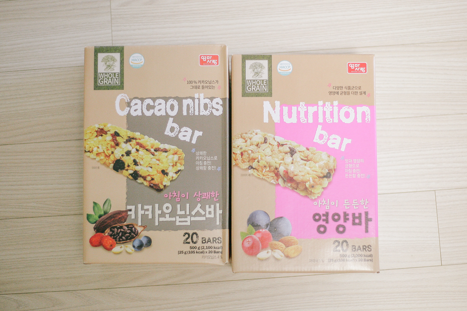 일단 두 가지 맛을 먹어보고 싶어서 주문했다. 두 종류다 동일하게 25g x 20개입으로 들어있다. 패키지에는 영양바에 함유되어 있는 성분을 직관적으로 간접적으로 확인할 수 있는 실사 이미지가 적용되어 있다.