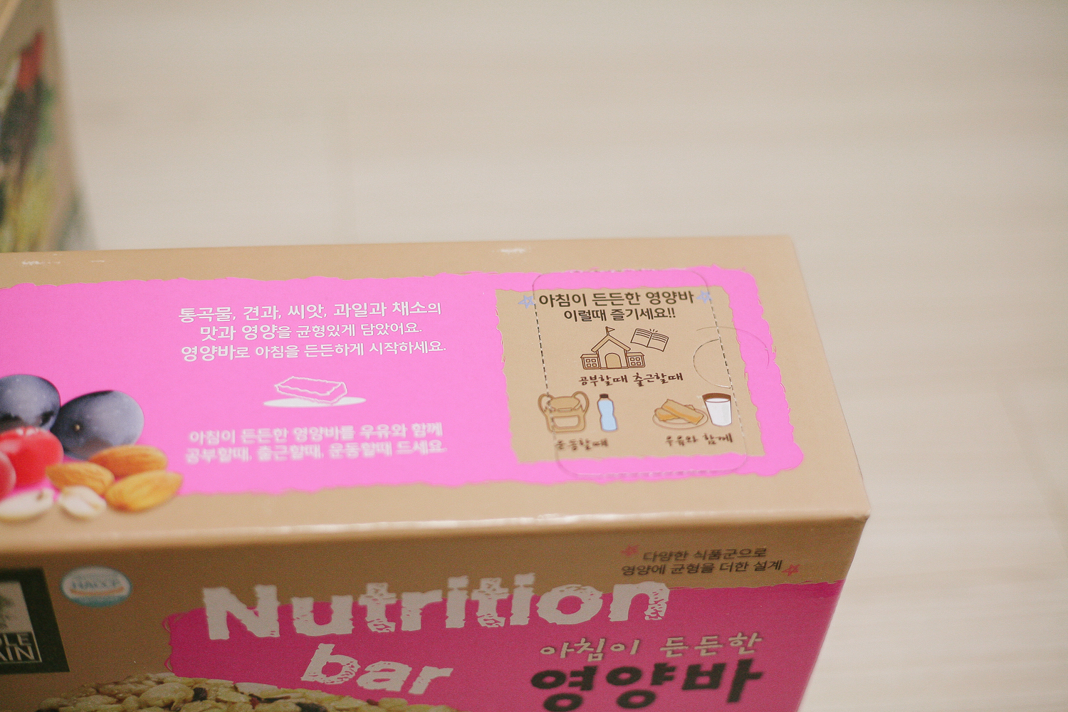 자, 맛이 어떤지 설레는 마음으로 한입을 먹어본다. 영양바 같은 경우는 과일류도 함유되어 있어서 달달하다가 중간중간 상큼한 맛이 있다. 확실히 초콜릿이 아닌 견과류 및 과일이 함유되어 있는 영양바를 먹으니 건강해진다고나 할까. 똑같은 간식이라도 몸을 조금이라도 신경 쓸 수 있는 것 같아 좋았다. 포만감도 적당히 있었다.